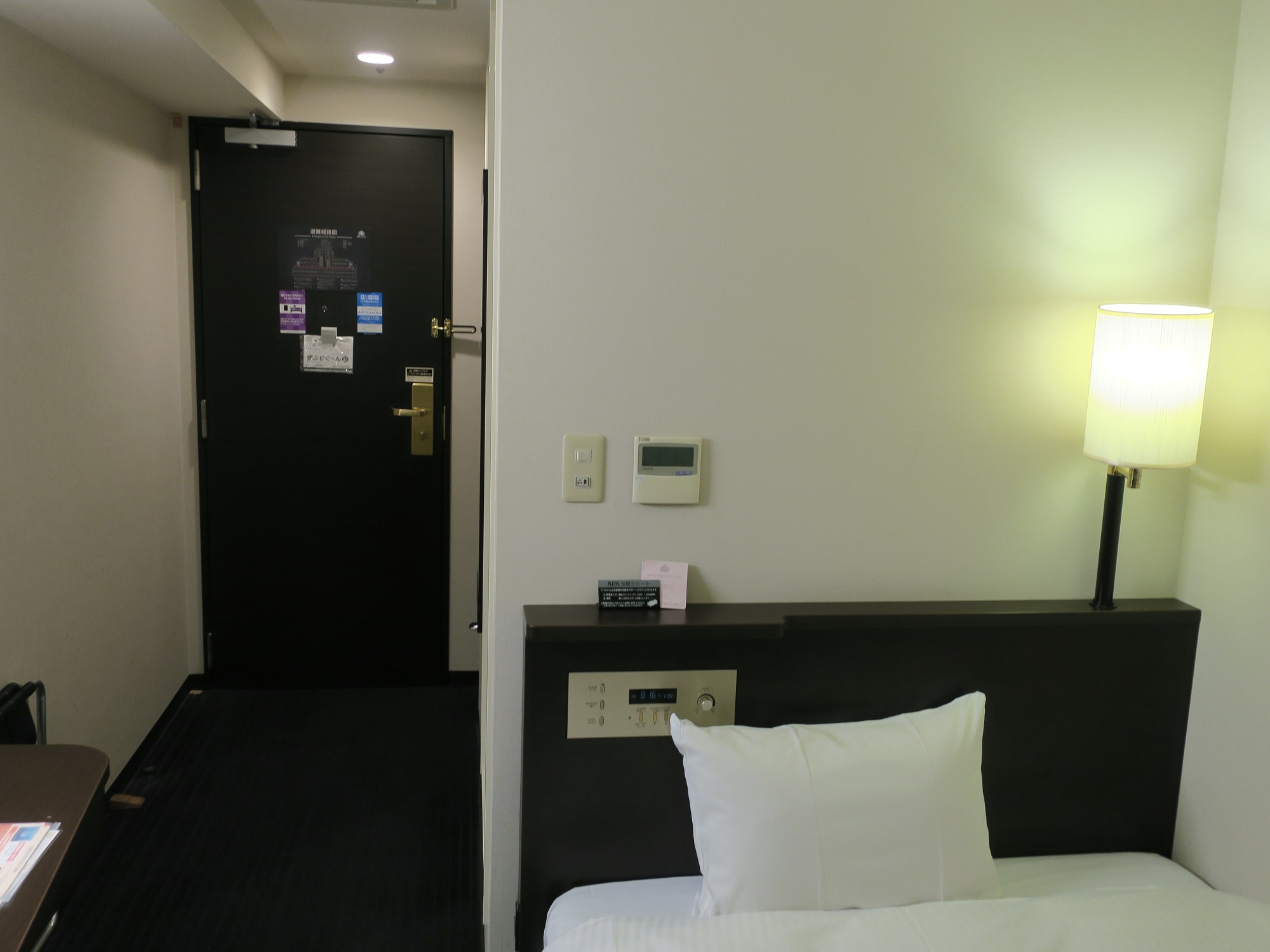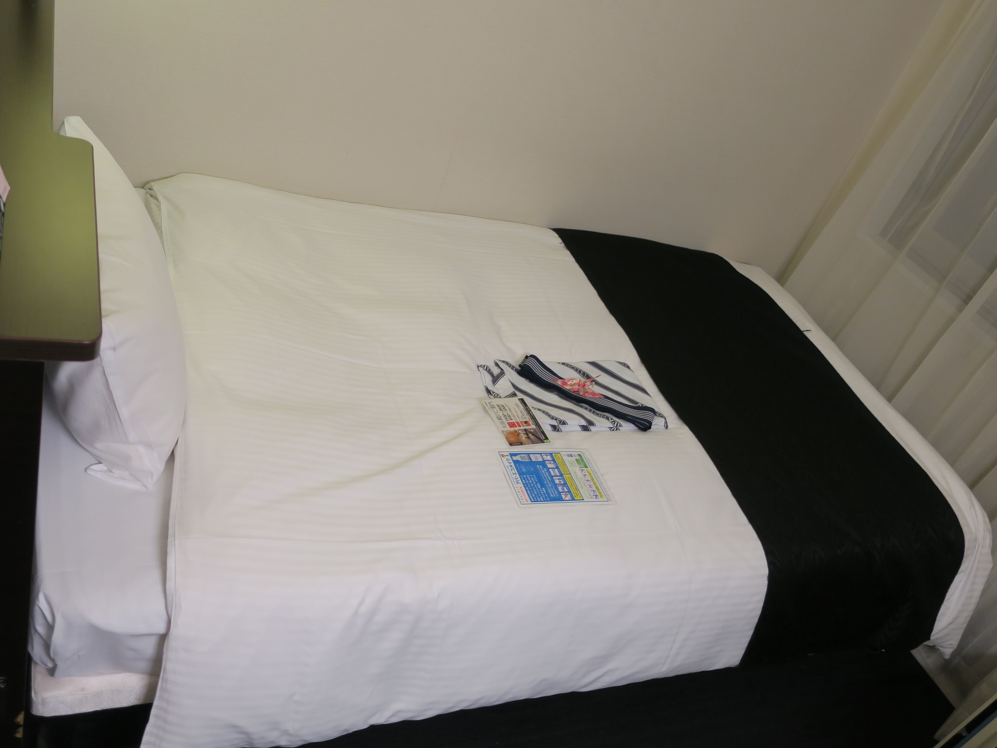 でもって、ベッドの端は窓のすれすれ。カーテンが通るスペースしか空いていません。ただし、ベッドはセミダブルでして、寝るには快適そのものでした。ホテルに行ったら寝るだけと割り切っている人にとっては、むしろこっちの方が正解かもしれません。
