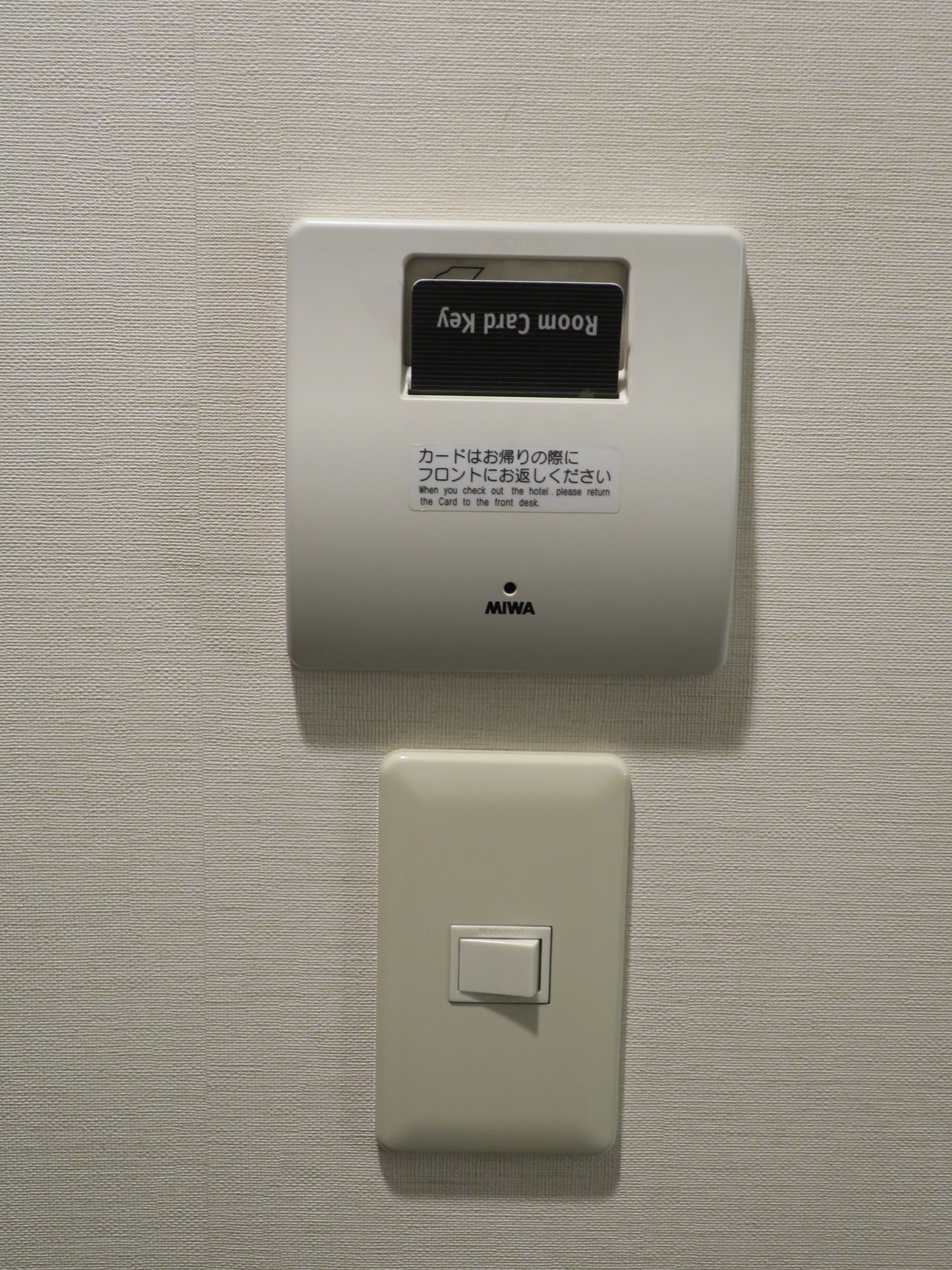 カードキー式になっていまして、カードキーを入り口のところにあるスロットに刺すと、室内の電源が入る仕組みです。