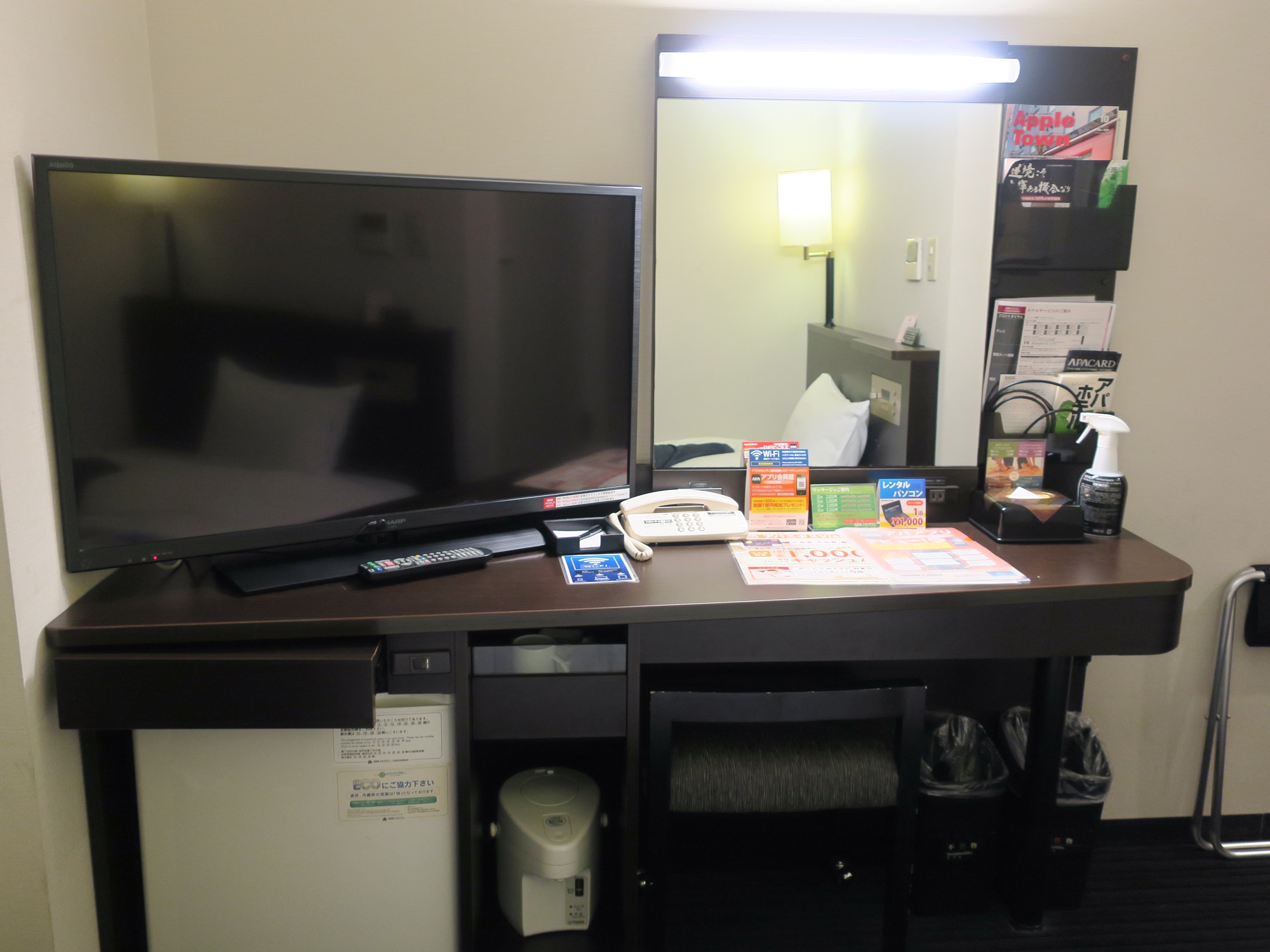 デスク回りです。狭いお部屋とは裏腹に、40インチのでっかい液晶テレビが置いてあります。はっきり言って、もっと小さいテレビでもよかったのでは? デスクの下には、空気清浄機(写っていませんが)と冷蔵庫、マグカップと電気ポットがあります。椅子の背もたれがほぼないので、快適とは程遠い感じです。