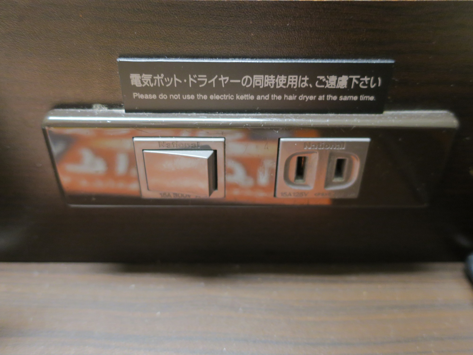 デスクの右側に、デスクの照明のスイッチと、ACコンセントがあります。正直なところ、ACコンセントは少なめ。なので、3つ以上欲しい人は、テーブルタップを持って行きましょう。