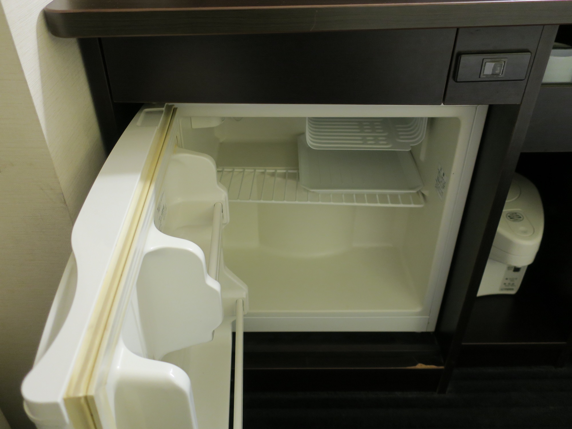 冷蔵庫の中身は空です。写真右上のスイッチを入れると、冷蔵庫が作動する仕組みです。