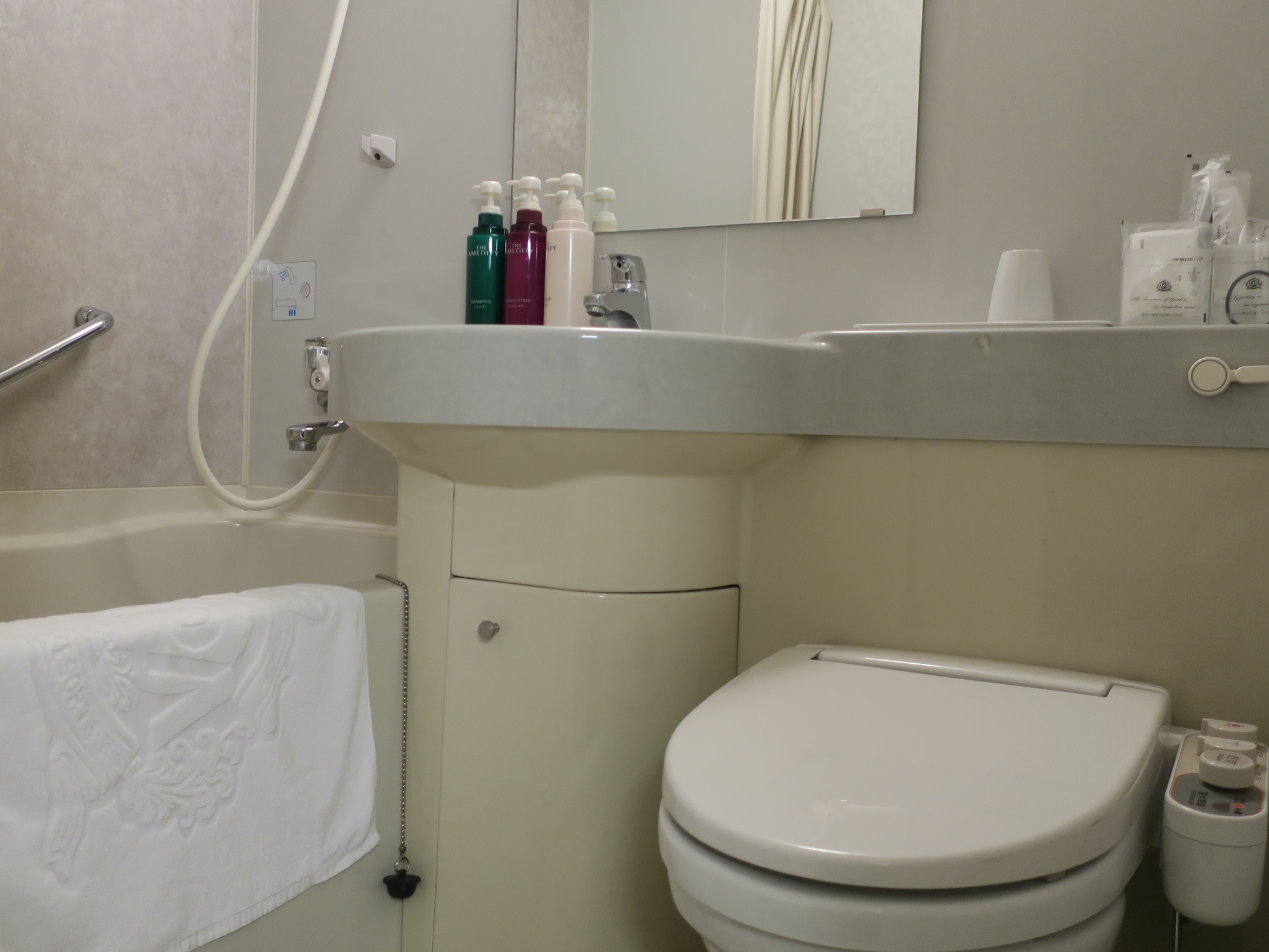 ユニットバスです。大浴場があるためか、バスタブはかなり小さめ。シャワーしか使えないぐらいに思った方がいいと思います。