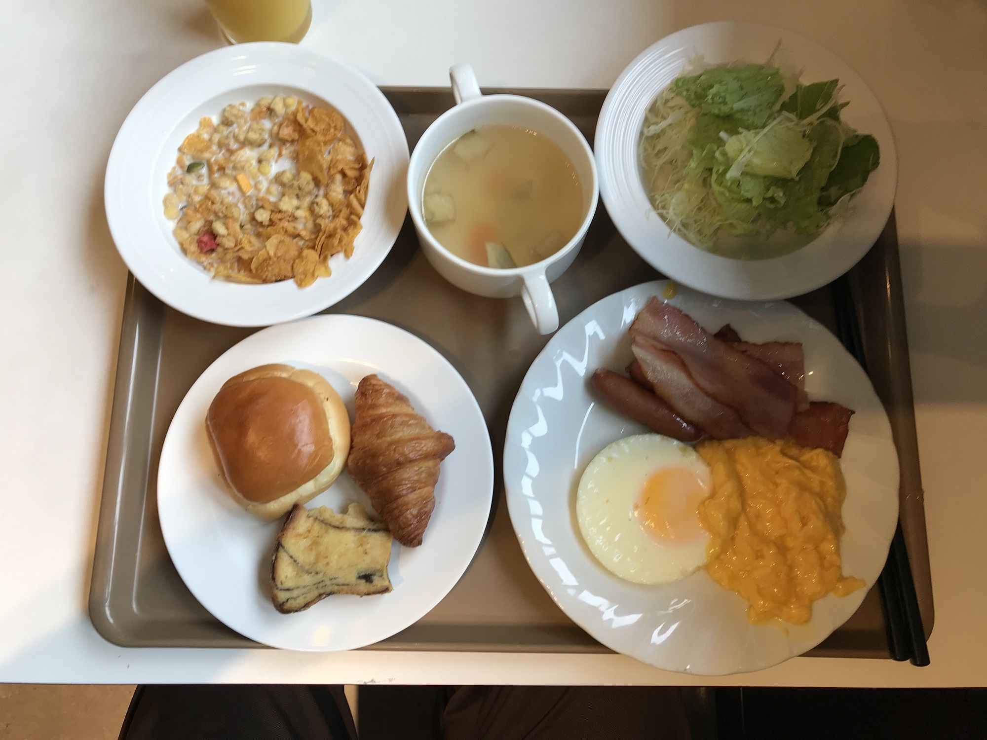 朝食です。スクランブルエッグと玉子焼きだけではなく、目玉焼きがあるのが嬉しいポイントです。その他、おかずはかなり充実しています。残念なのはわかめスープで、薄すぎて味がなかったです。