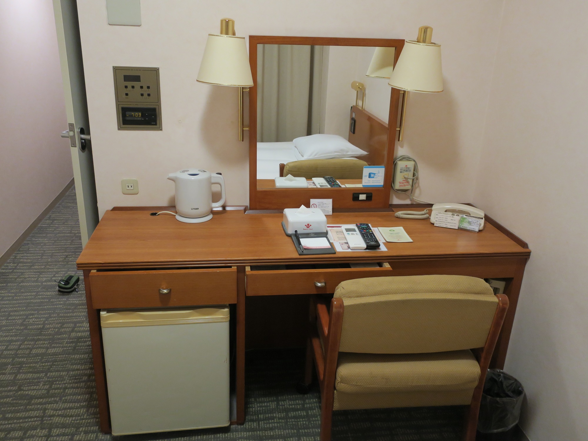 テレビは、窓側の端に置いてあります。でもって、これが絶妙な位置だったりします。まず、ベッドに寝っ転がったり、椅子を横に向けたら十分見えます・・・て、これは当たり前なのですが。特筆すべき点は、デスクに向いた時。なんと、デスクの鏡越しにテレビが見えるんですね。なるほど、うまい方法を考えたもんです。