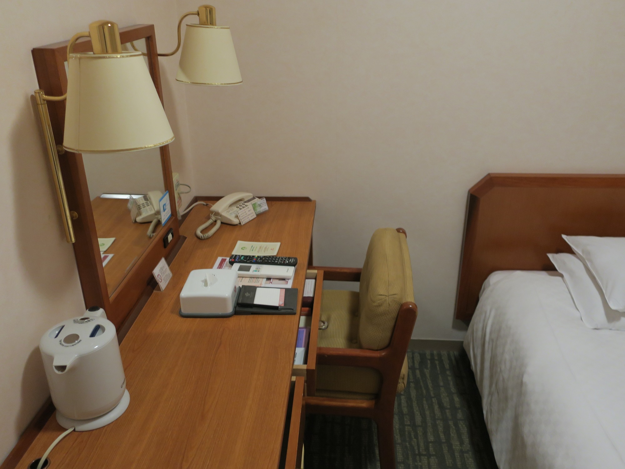 シングルルームを入り口側から見るとこんな感じ。ベッドは窓側に配置されているという、ちょっと珍しいお部屋です。窓から外を見ると、北側のお部屋だったらJR大阪駅を発着する電車が見えます。が、南側のお部屋だったら隣のビルしか見えません。なので、窓から見える景色は、部屋によって当たりはずれがあります。