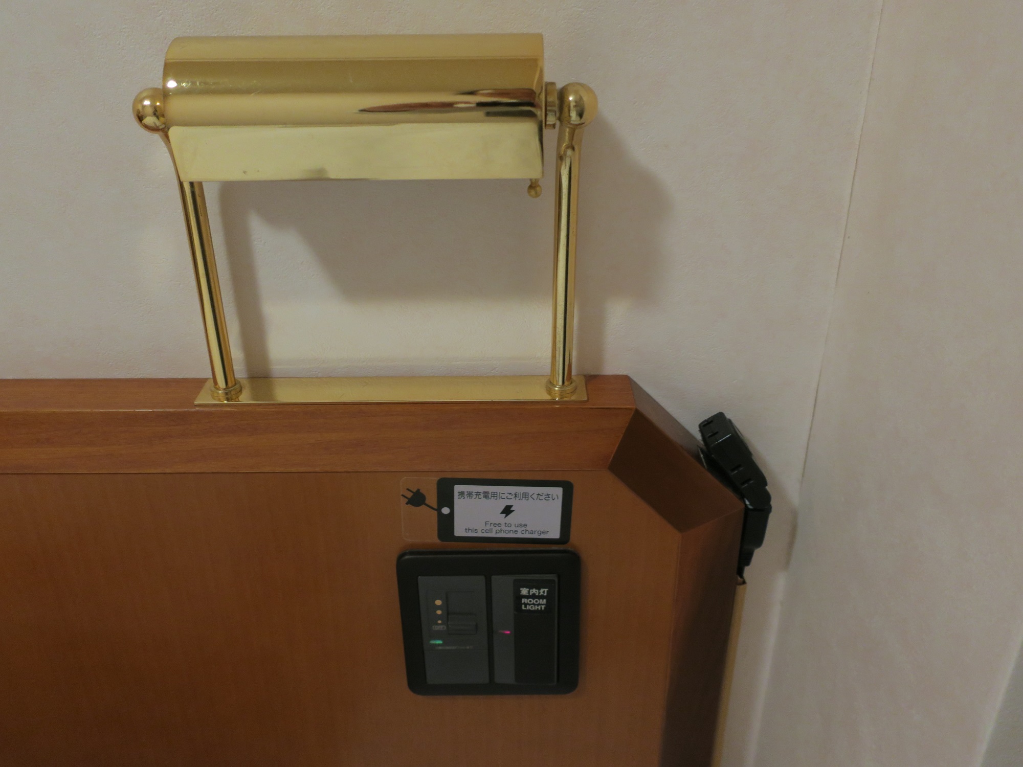 枕元にはACコンセントがあります。ケータイ・スマホの充電ならこのACコンセントをどうぞということなんですが、ケータイ・スマホを置くスペースがなく。だったら、窓側じゃなくて、デスク側につけて欲しかったですね。