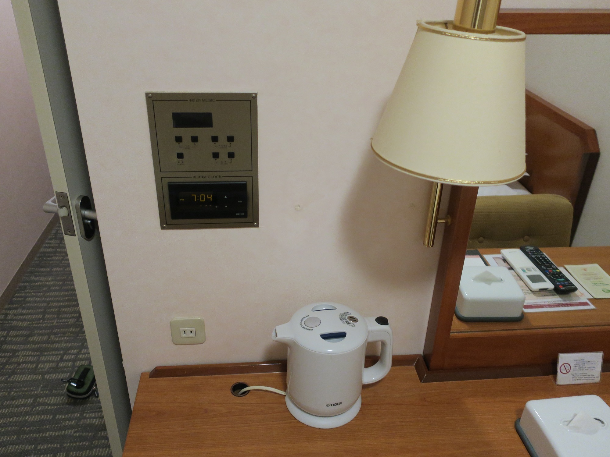 デスク左側にはミュージックサービスと時計、ACコンセント、電気ポットがあります。ミュージックサービスは、ちゃんと作動します。また、時計はベッドからも意外と見やすかったです。