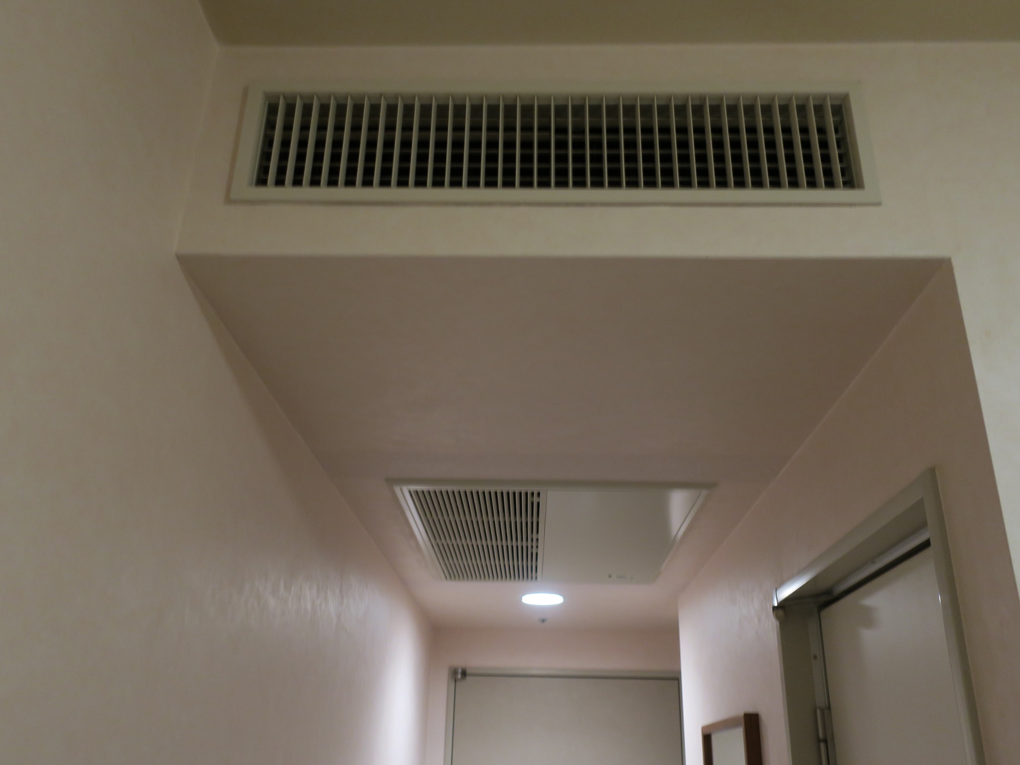 エアコンのリモコンを操作すると「ピピッ」と音がして反応するので(・・・て反応しないんだったらリモコンを置く意味がないのですが)、一体どこにエアコンがあるのかと思ったら、ユニットバスの入り口辺りにありました。