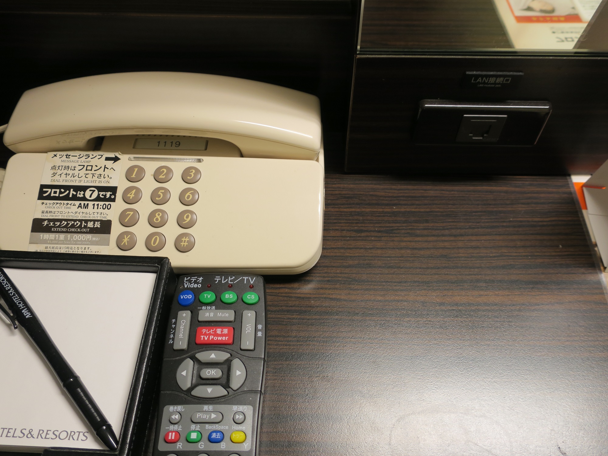 デスク回りです。左側に電話機、右側にACコンセントと照明のスイッチがあります。ACコンセントは、この1個だけ。なので、ノートPCとスマホを同時に充電しようと思ったら厳しい感じです。できればテーブルタップを持って行った方がいいと思います。