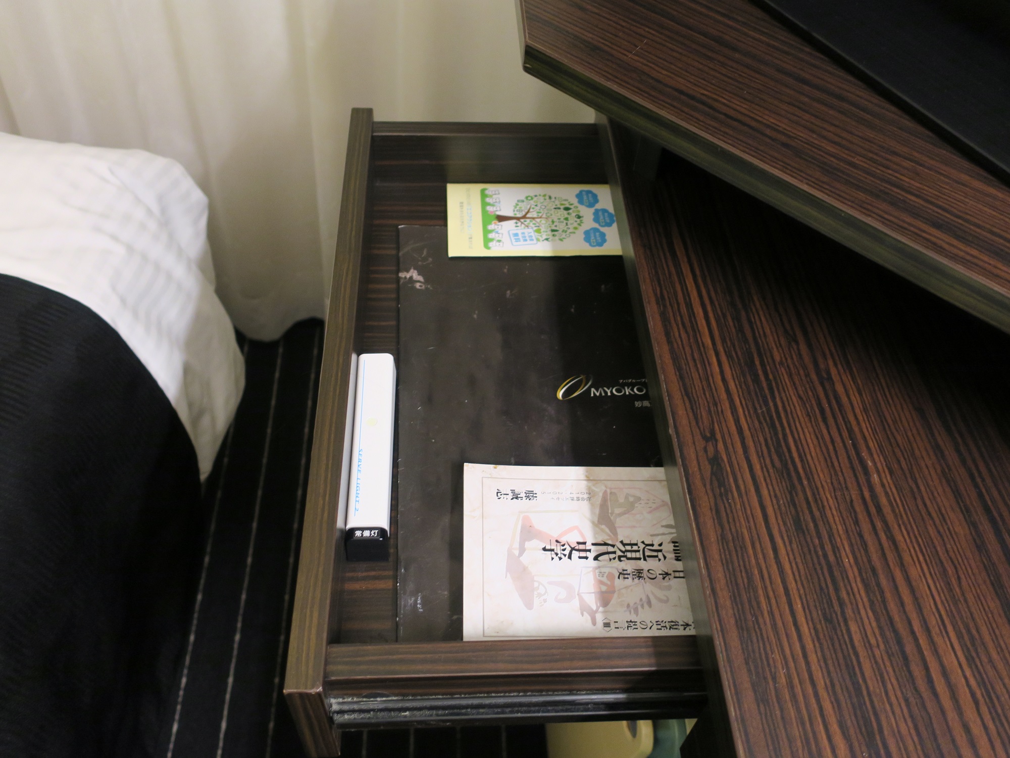 もう一つの引き出しには、ドライヤーと伝票類が置いてあります。コインランドリーは大浴場にあるのですが、洗濯機と乾燥機が一組しかないので、争奪戦が激しいです。コインランドリーはないものと思った方が良さそうです。