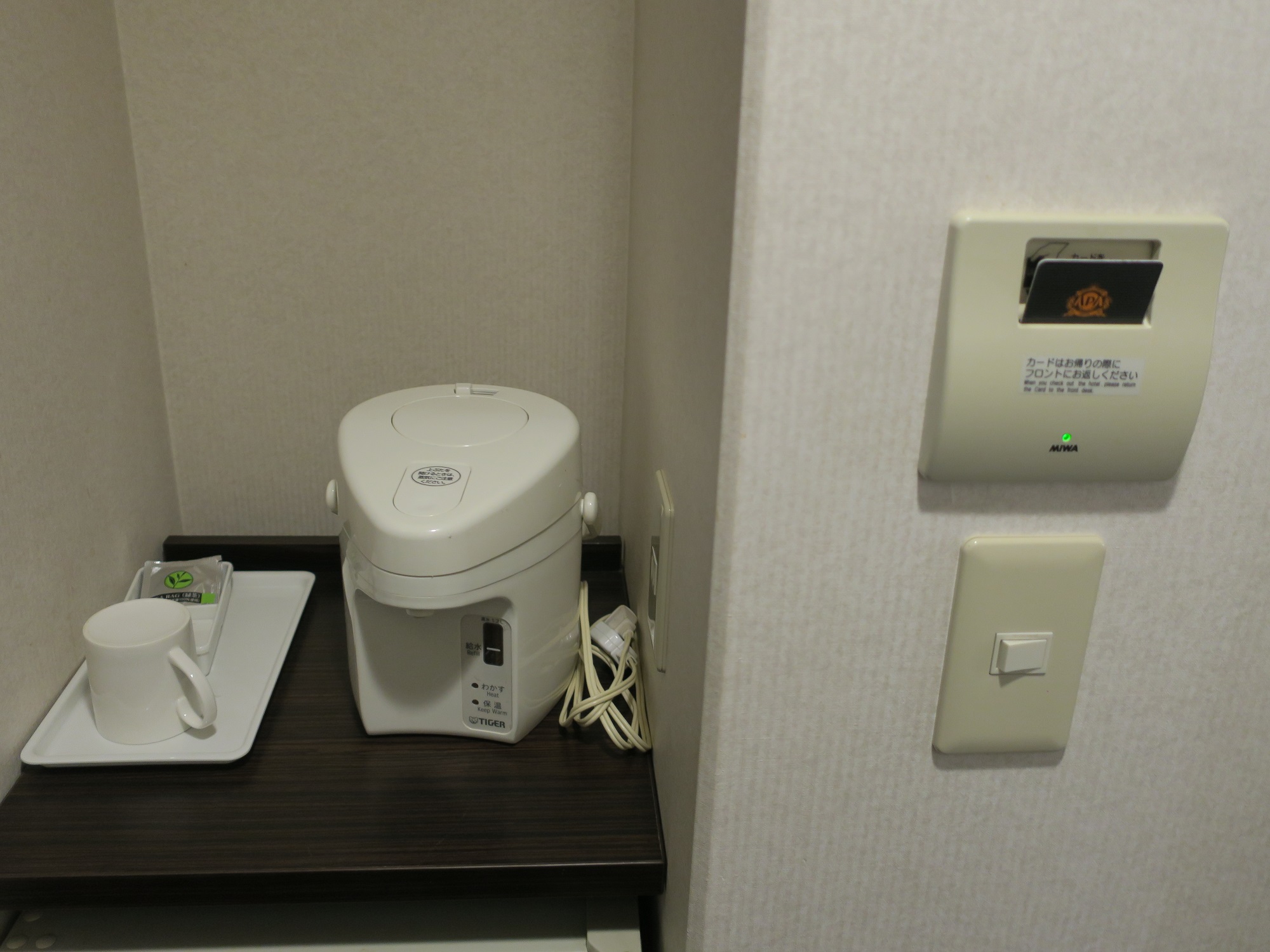 つまり、入り口のすぐ横ですね。冷蔵庫の上には、電気ポットとマグカップが置いてあります。できればコップが欲しいところ。