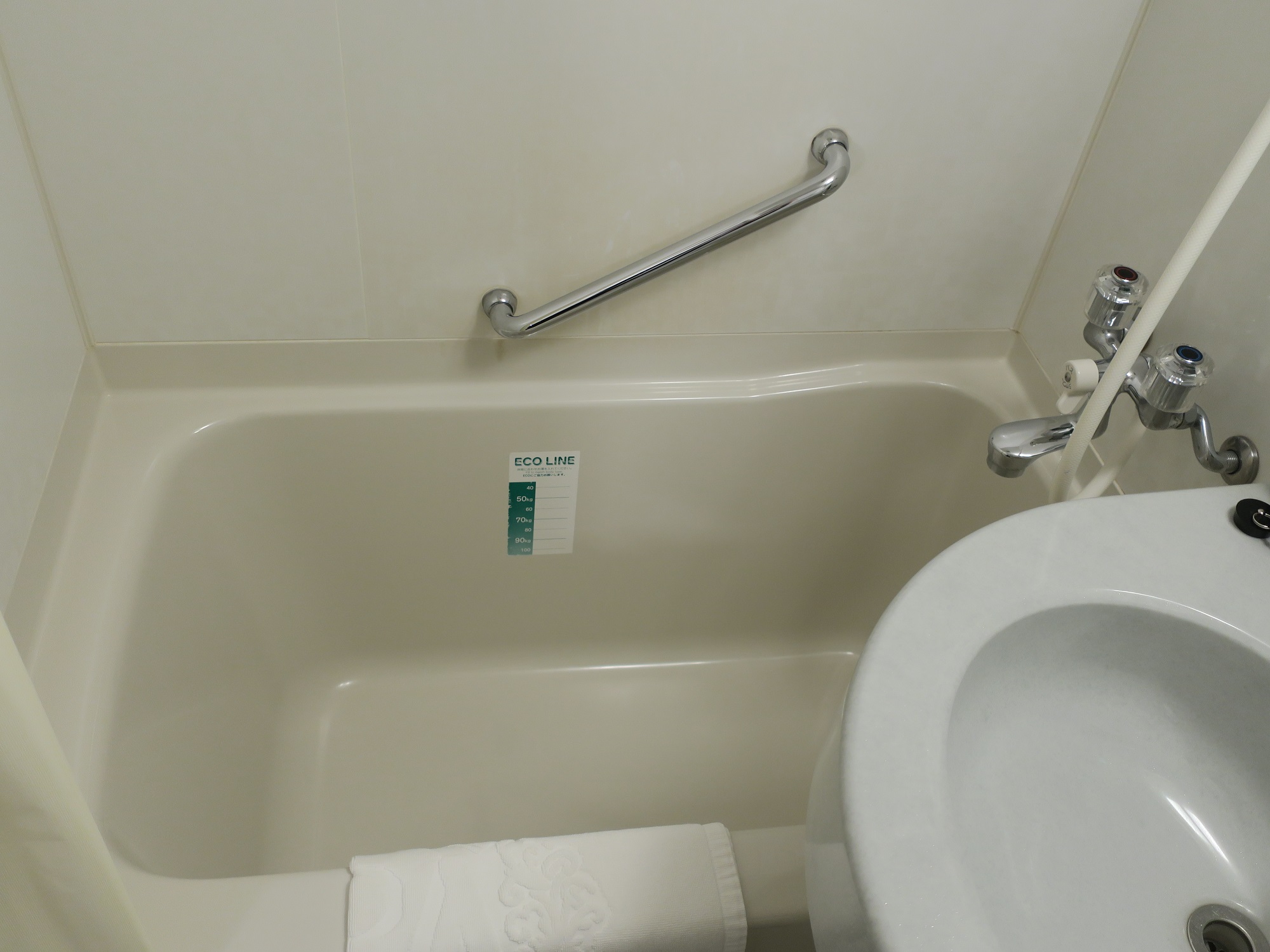 「ゆっくりお風呂に入りたい人は、大浴場をどうぞ」と割り切っているのか、お部屋の浴槽はかなり狭いです。事実上、シャワーしか使えないと思った方が良さそうです。とはいえ、諸般の事情で大浴場が利用できない人にとっては、お風呂があるだけでもありがたいと言えるでしょう。