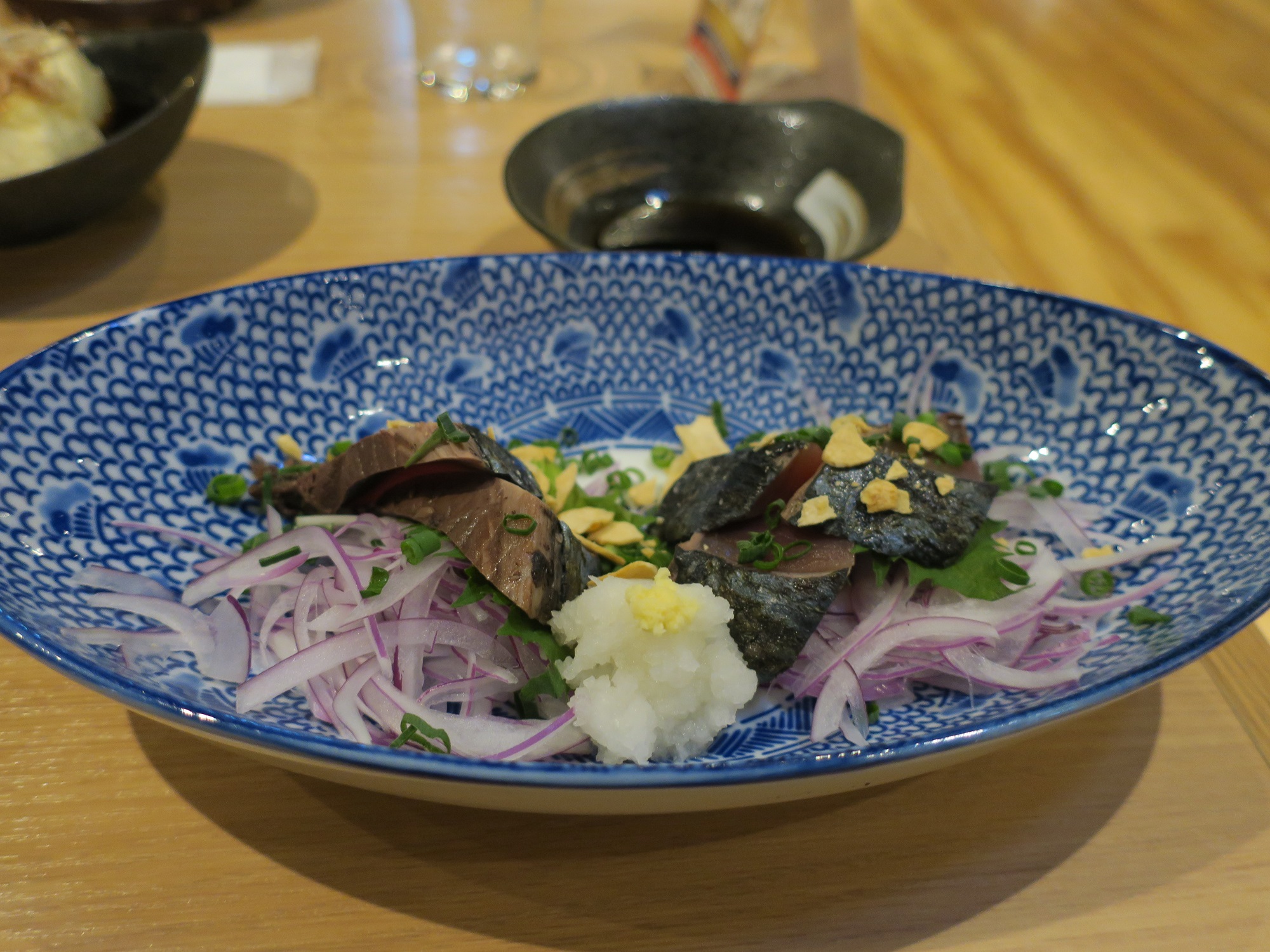 続いて、初鰹のたたき。918円と、ちょっといいお値段でした。高知県の人が見たら「???」ものの薬味がありまして、それは何かといいますと、大根おろし。確かに、カツオのたたきにポン酢、オニオンスライス、にんにく・・・とここまではわかるんですけど、なぜ大根おろし??? でも、鰹は全然臭みがなく、これも絶品でした。にんにくがフライドガーリックになっているのも、これはありかなと思いました。