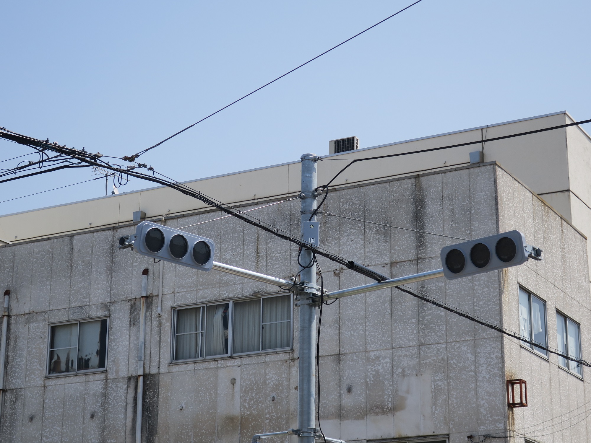 こちら、マンガロードのLED式信号機。ちょっと変わった形をしていますね。