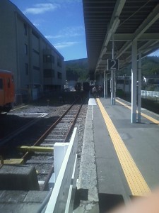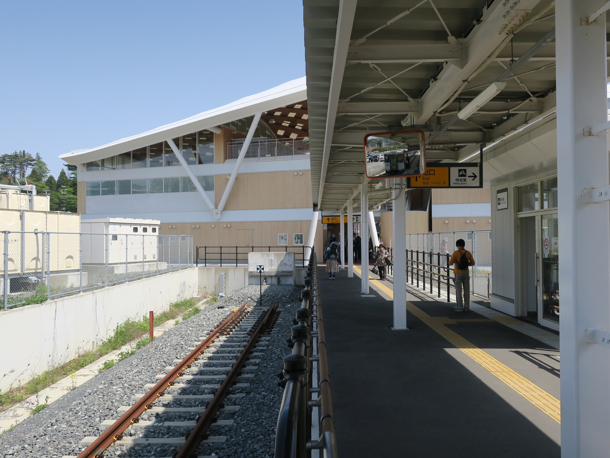 で、こちらが震災後に再建された女川駅のホームです。列車は1編成だけ止まれます。ま、昼間は2時間に1本ぐらいしか列車が来ないので・・・