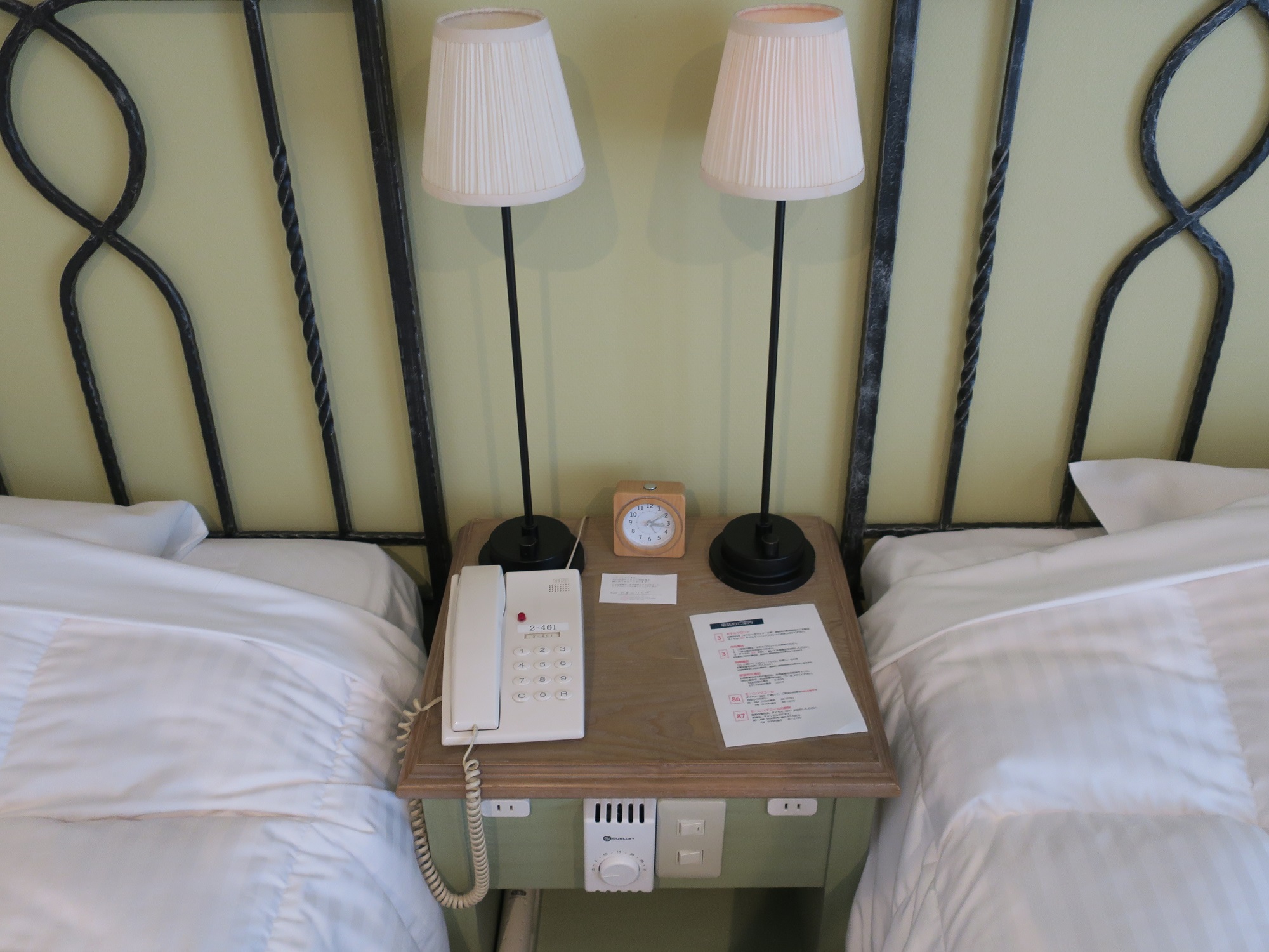 枕元にスタンドがあります。それから、電話と目覚まし時計、スイッチ類、コンセントがあります。スタンドとコンセントが2つあるのがありがたいですね。これならケータイやスマホを枕元に置いたまま充電できます。