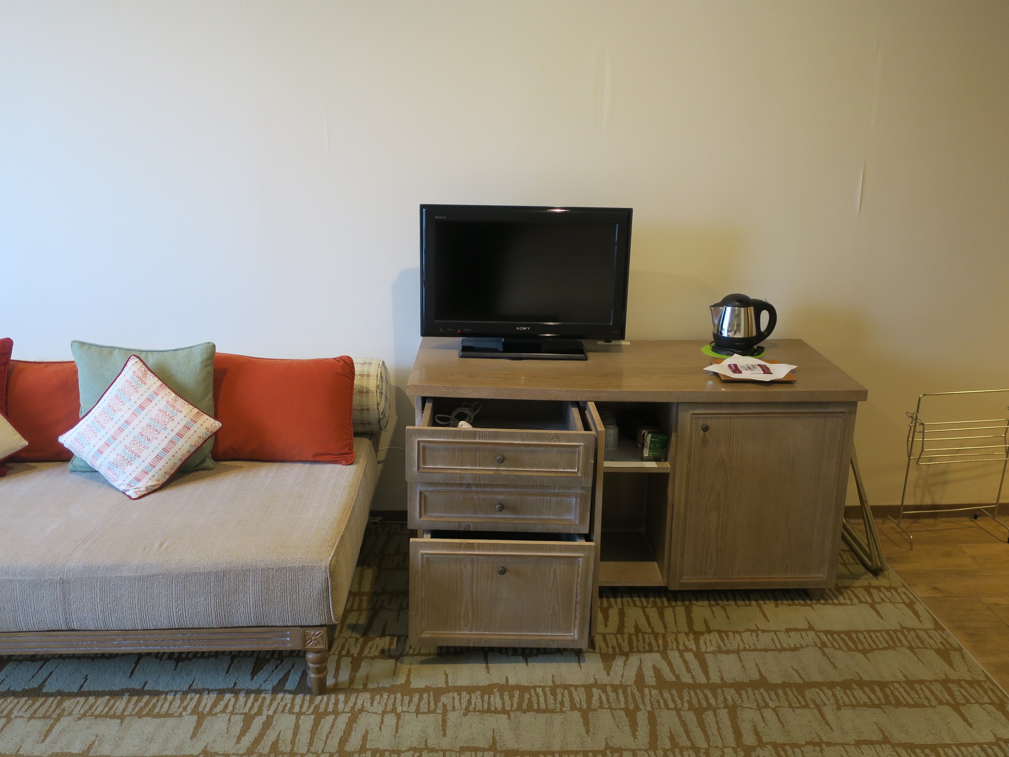 ソファーベッドが置いてあります。もし3人で泊まった時は、これがエクストラベッドになります。ただ、ソファーベッドがこの位置だと、テレビが見えないんですね。なので、正直に言うと使い勝手はあまりよくありません。これだったらもう少し小さめのソファーを、デスクが置いてある場所に置いた方が使い勝手は良さそうに思います。(もっとも、それだと別の問題が出るのですが、それは後で説明します)