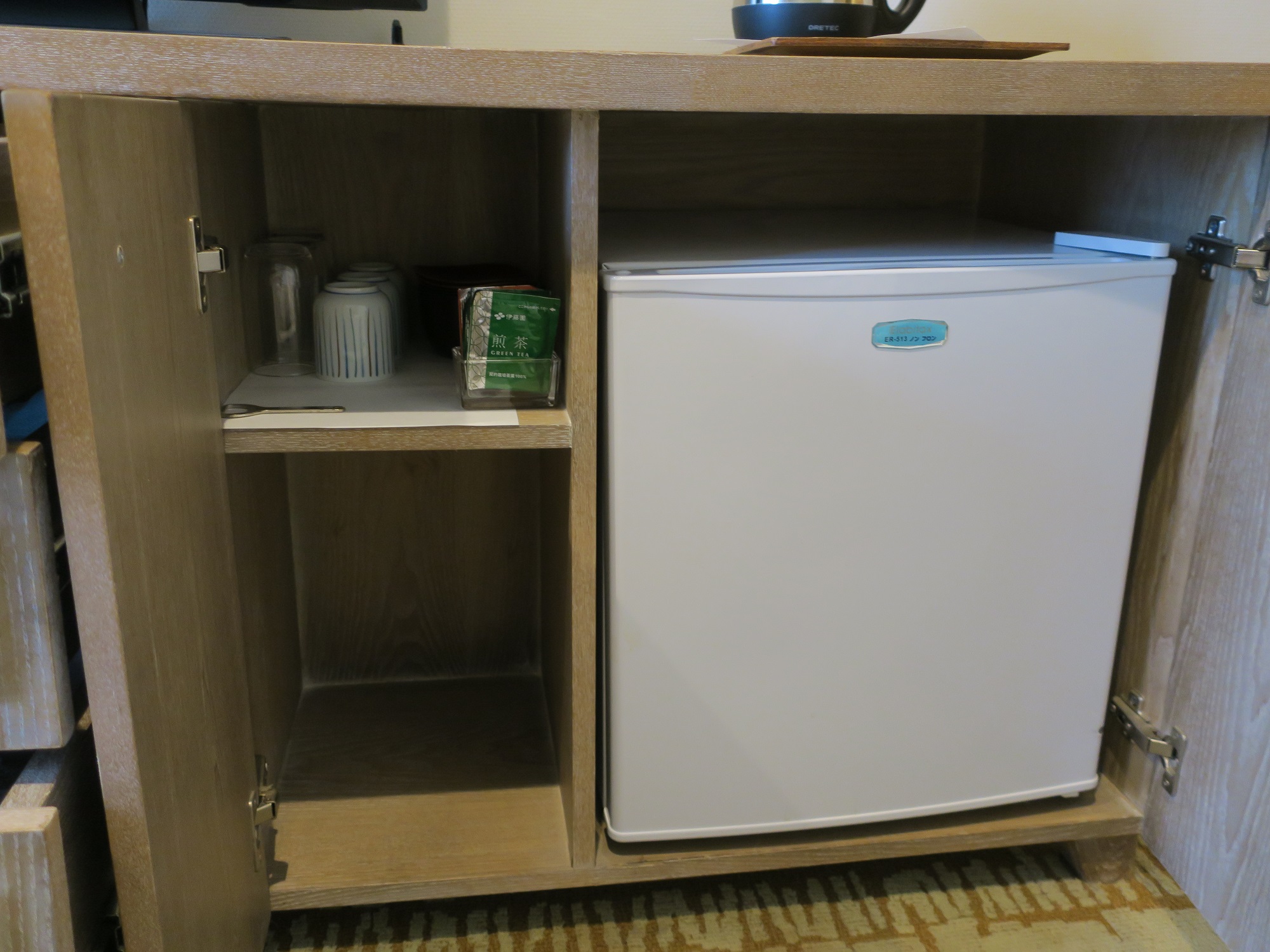 テレビ台は引き出しが付いています。また、扉を開けるとお茶セットと冷蔵庫が出てきます。冷蔵庫の中身は空です。館内には自動販売機がありまして、ソフトドリンクだけじゃなくてビールも買えます。また、テルメテルメと道路を挟んで反対側に、コンビニ(セーブオン)があります。
