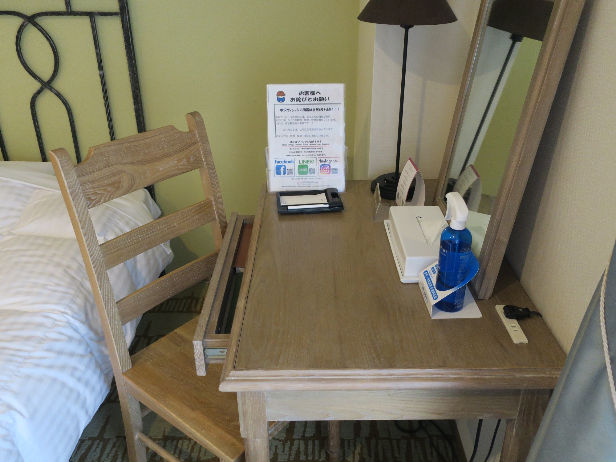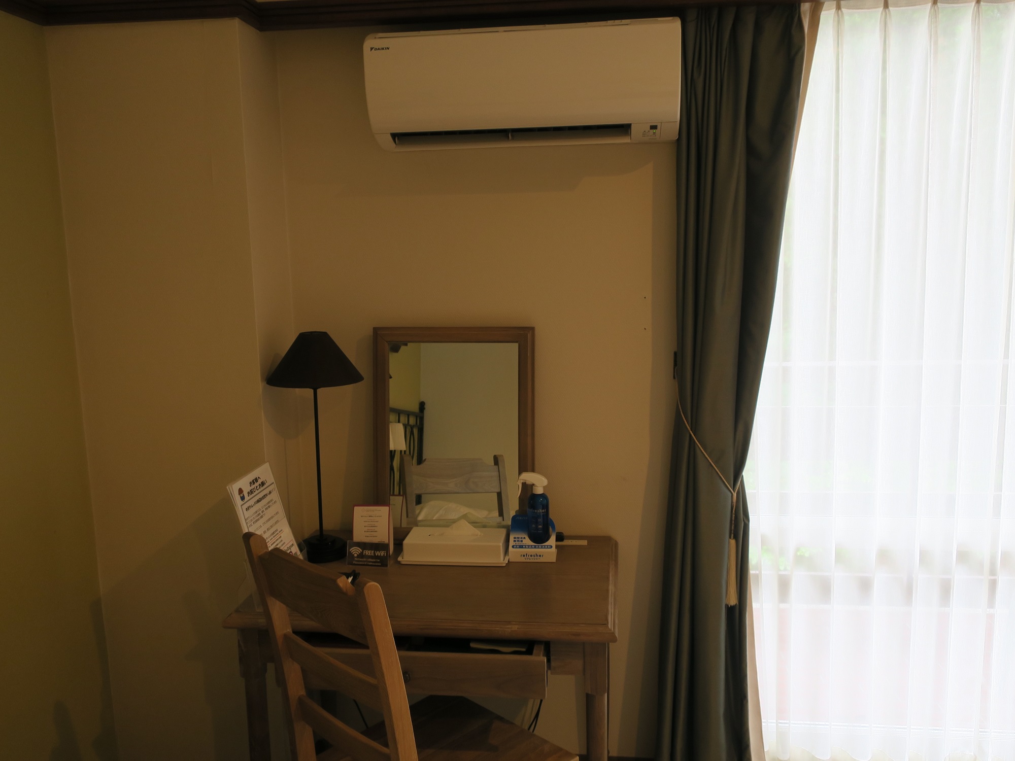 窓の隣にデスクがあります。ただし、それほど大きくないので、使い勝手は今ひとつ。およそノートPCを広げたらいっぱいいっぱいです。ま、ここは草津温泉なんだし、高原リゾートなんだし、ここで仕事をするのはやめましょうということなんでしょうね。