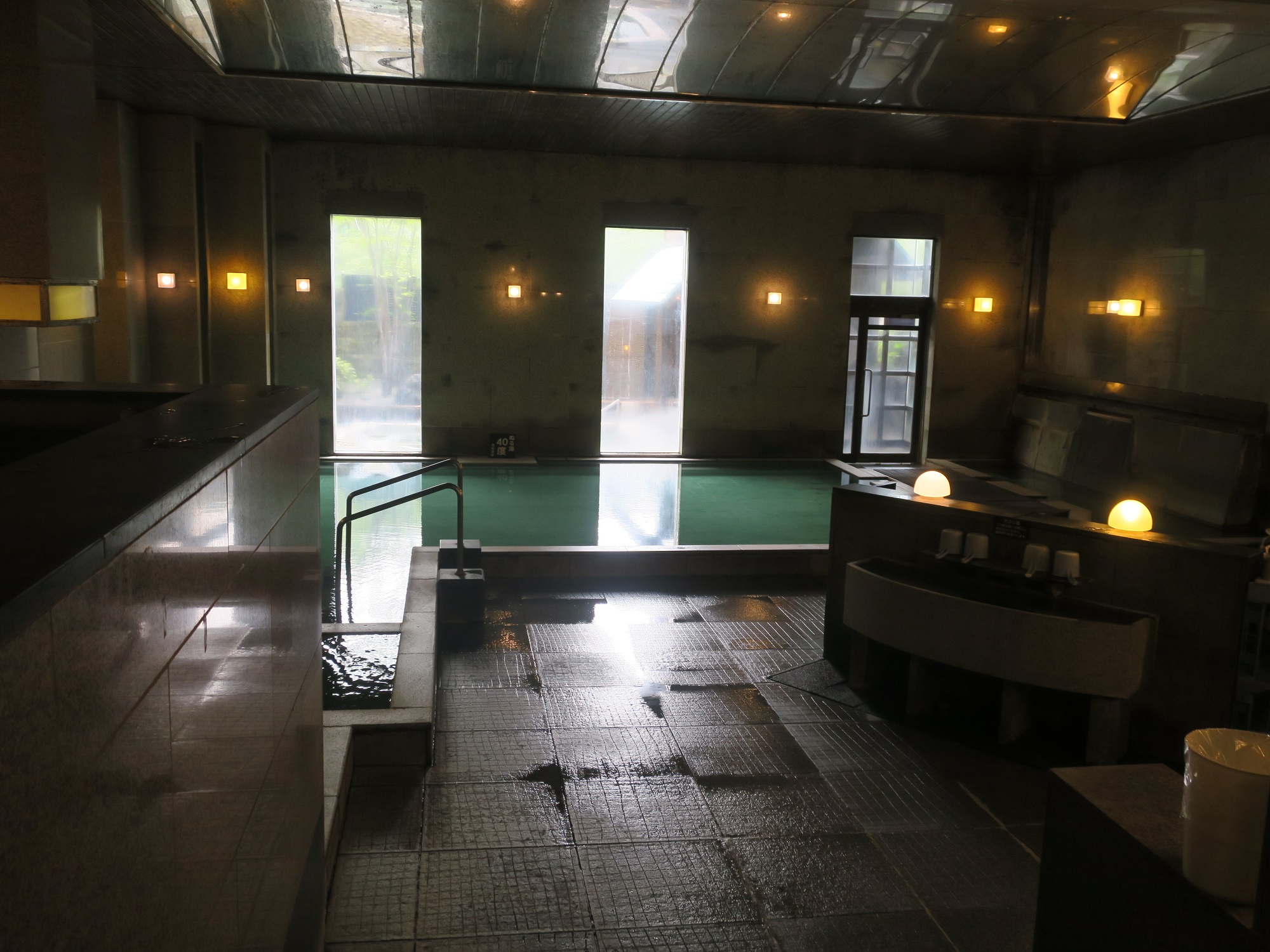 大浴場は湯畑のお湯を引いているそうで、内湯があつ湯とぬる湯。それに露天風呂があります。強酸性の含硫黄-アルミニウム-硫酸塩・塩化物温泉で、お湯は無色透明です。キューティー吉本の体感温度的には、あつ湯が43~44℃、ぬる湯が40℃、露天風呂が41℃でした。