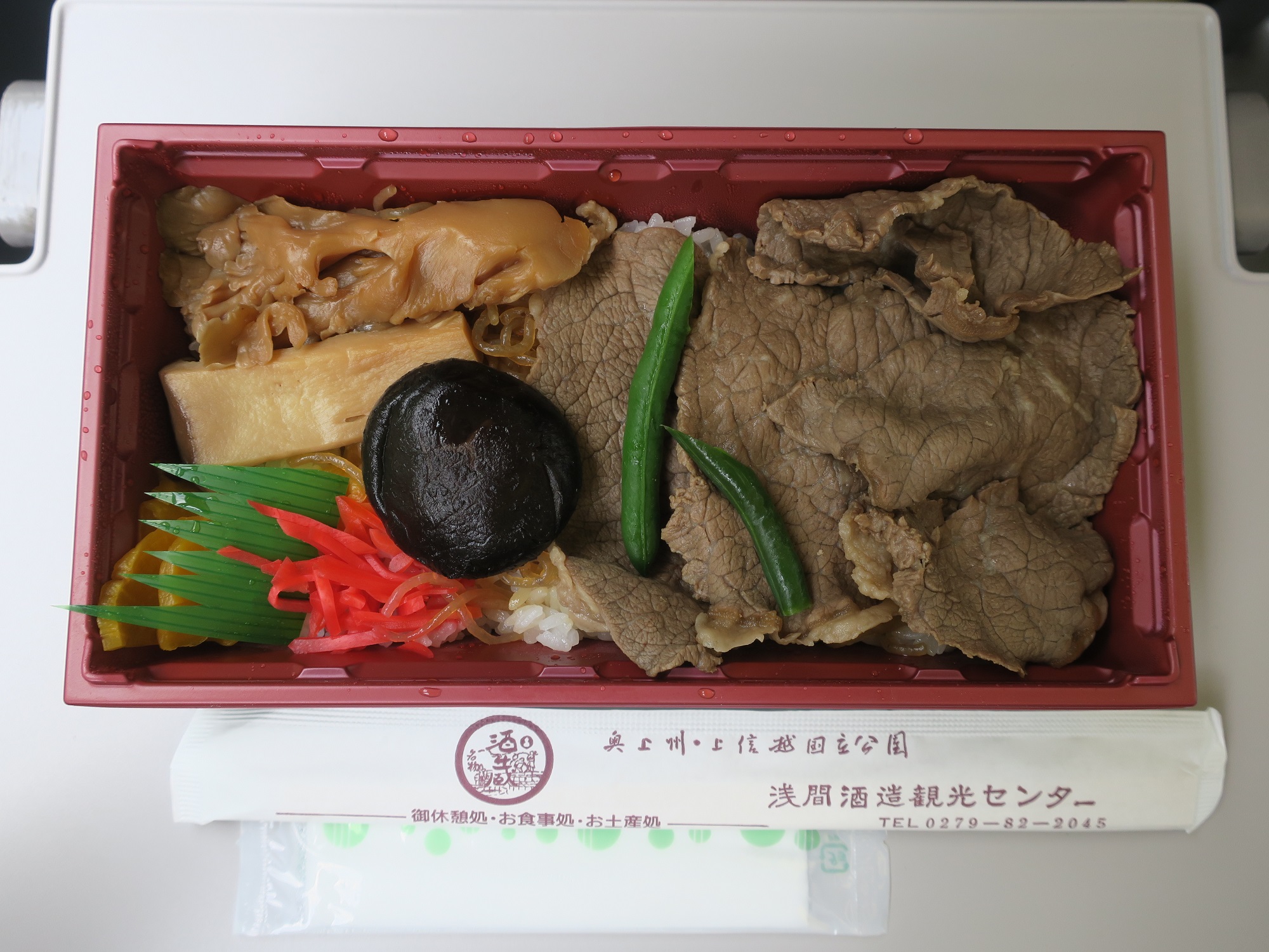 草津温泉からの帰りは、駅弁にします。長野原草津口駅で買った、上州牛すき焼き弁当です。ぐんまちゃんのイラストがかわいいですね。