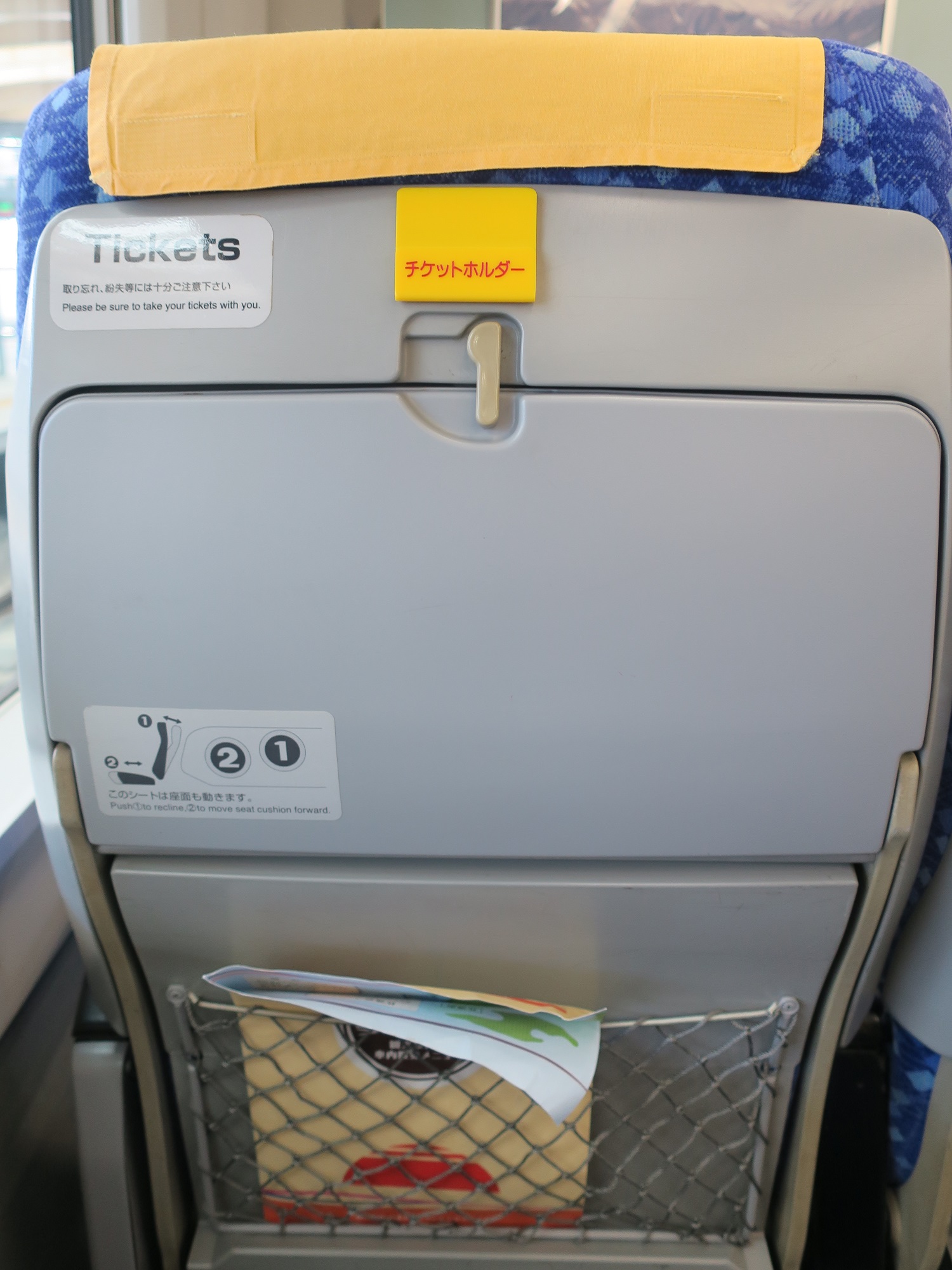 シート背面です。チケットホルダーが付いているのと、ボタンの使い方の説明が書いてあるのが特徴的ですね。