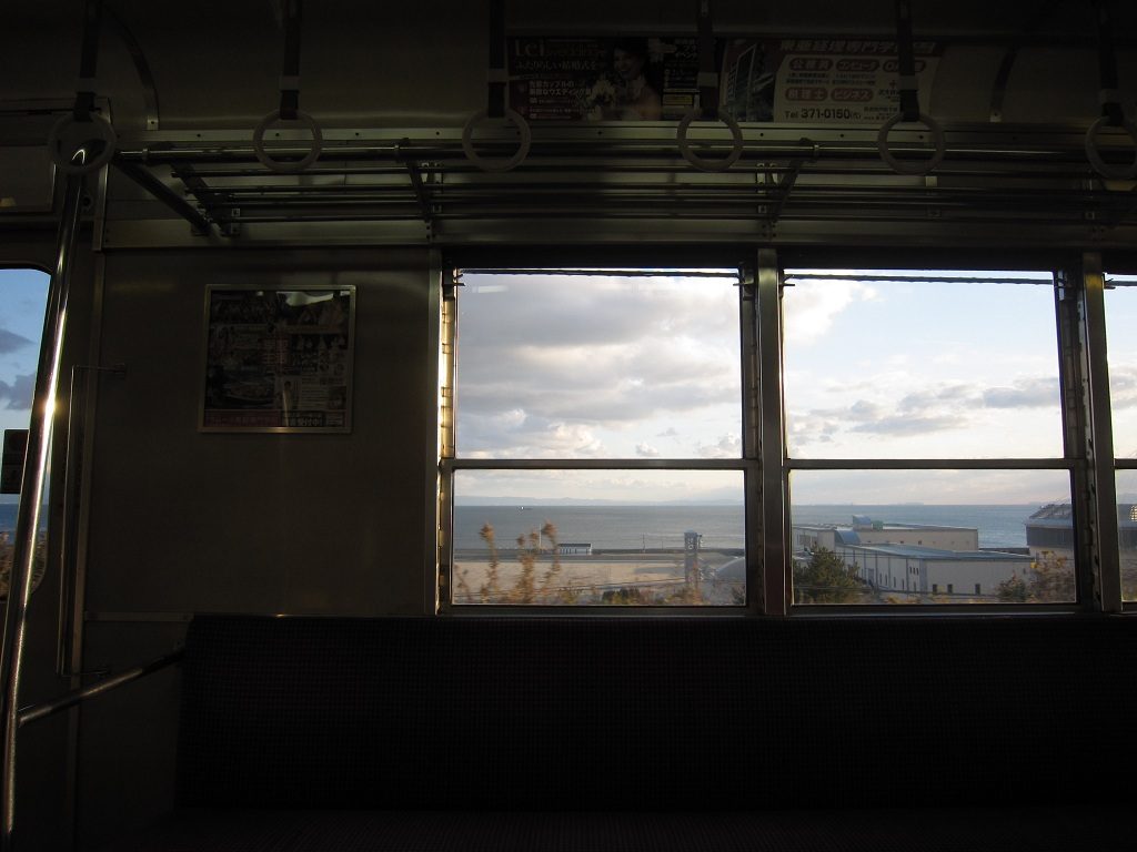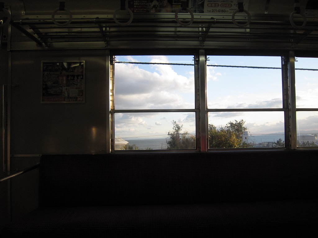 さて、霞ヶ丘を出てからしばらくの間は、海のすぐ近くを走ります。なので、車窓から見える風景も、ご覧のとおりです。いやー、車窓から海が見えるっていいですねー。もっとも、JRも平行して走っているので、JRに乗っても海が見えるんですけどね。