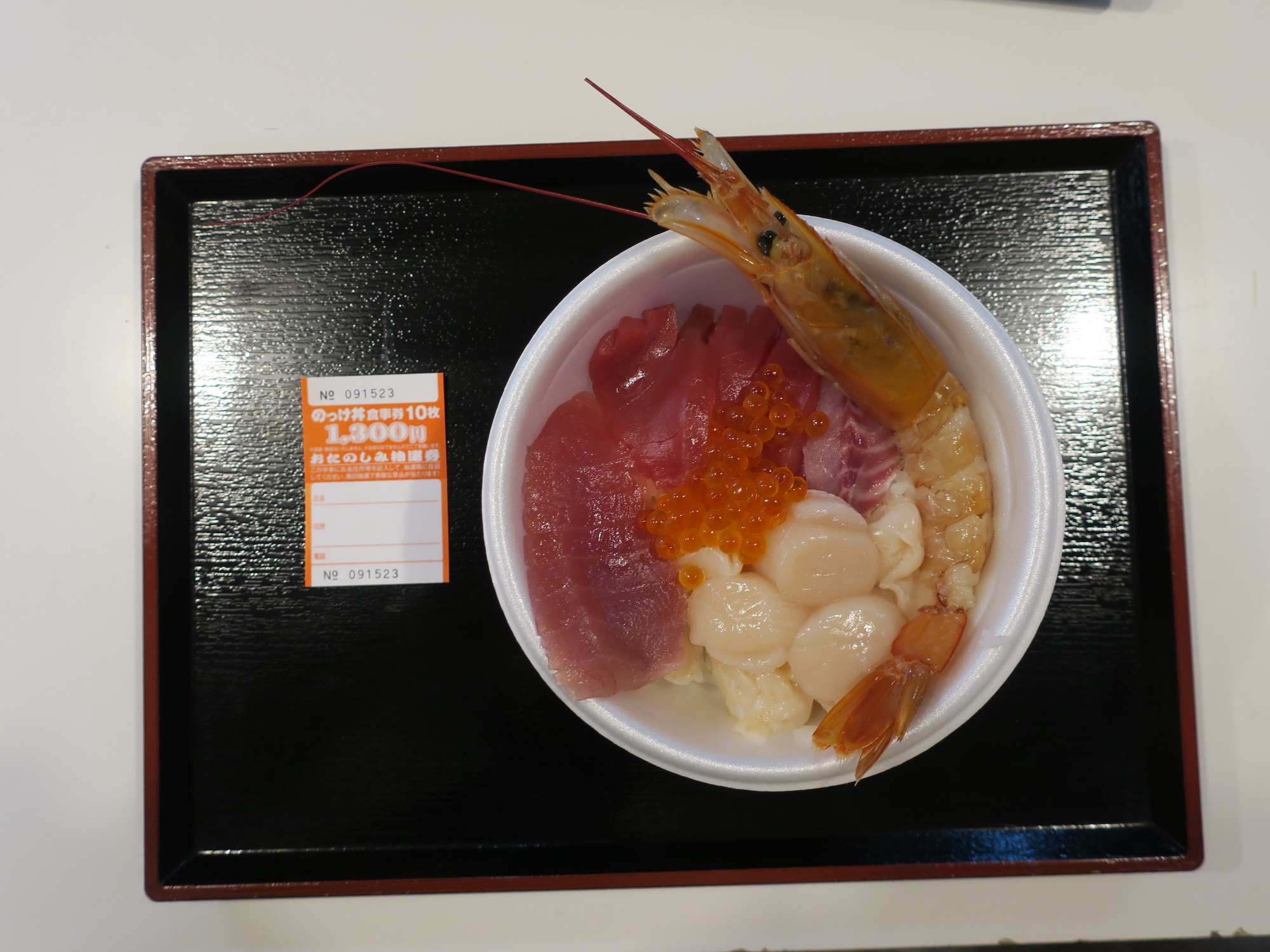 ここの名物は、のっけ丼です。まずはチケットを買います。で、ご飯と具を市場の中のお店で買って(正確に言うと、チケットと引き換えて)、自分で勝手に丼ぶりを作るんです。これが、キューティー吉本作ののっけ丼です。まぐろ、ホタテ、ボタンエビ、いくらなどを載せました。わさび醤油でいただきます。