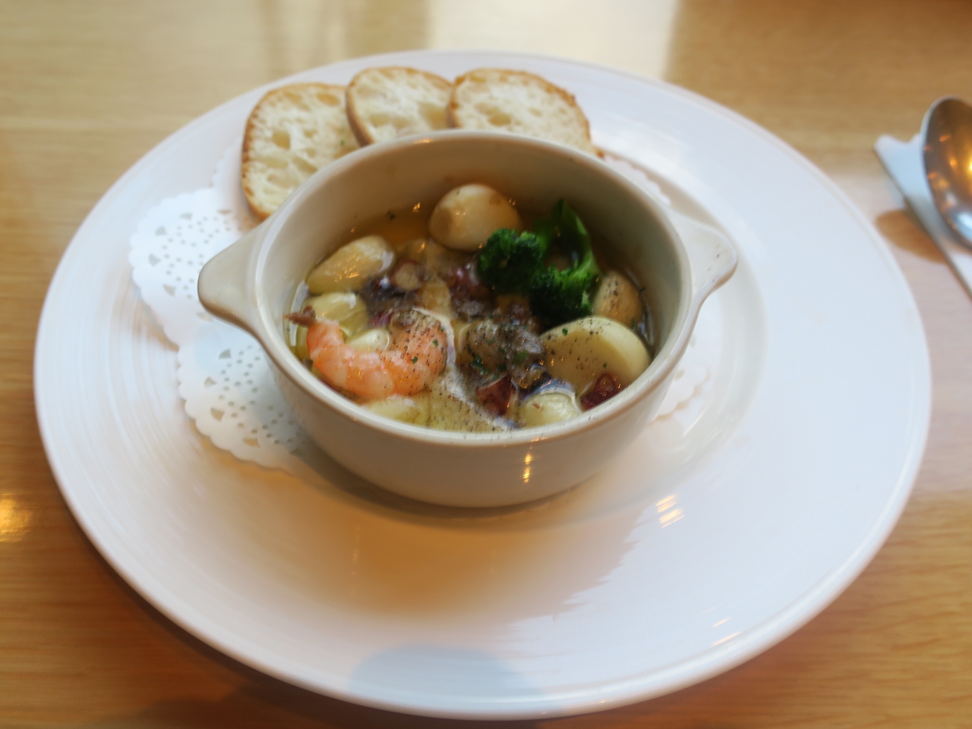 続いて、魚介類のアヒージョを注文。昔、にんにくのオイル焼きなるメニューがありまして、元気がないときに頼んでいたのですが、なくなりまして。残念だなーって思っていたら、さすが舞浜ユーラシア。ちゃーんとニンニク度の高いメニューを作ってくれました。これ、魚介類よりも、主体はにんにく。これはうまいですねー。オリーブオイルもいけちゃいますね。