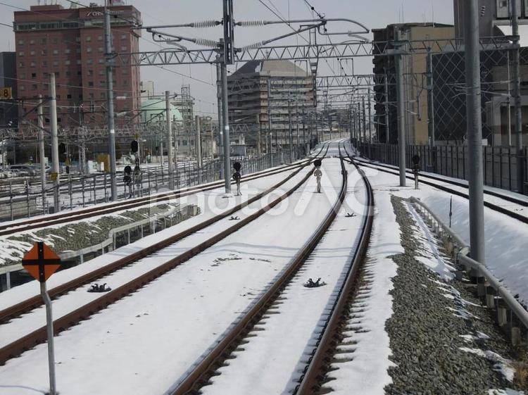 長野って雪深いってイメージだと思うのですが・・・その通りです。これは、長野駅の新幹線ホームから撮影したんですけど、レールの部分を除いて雪が積もってるんです。