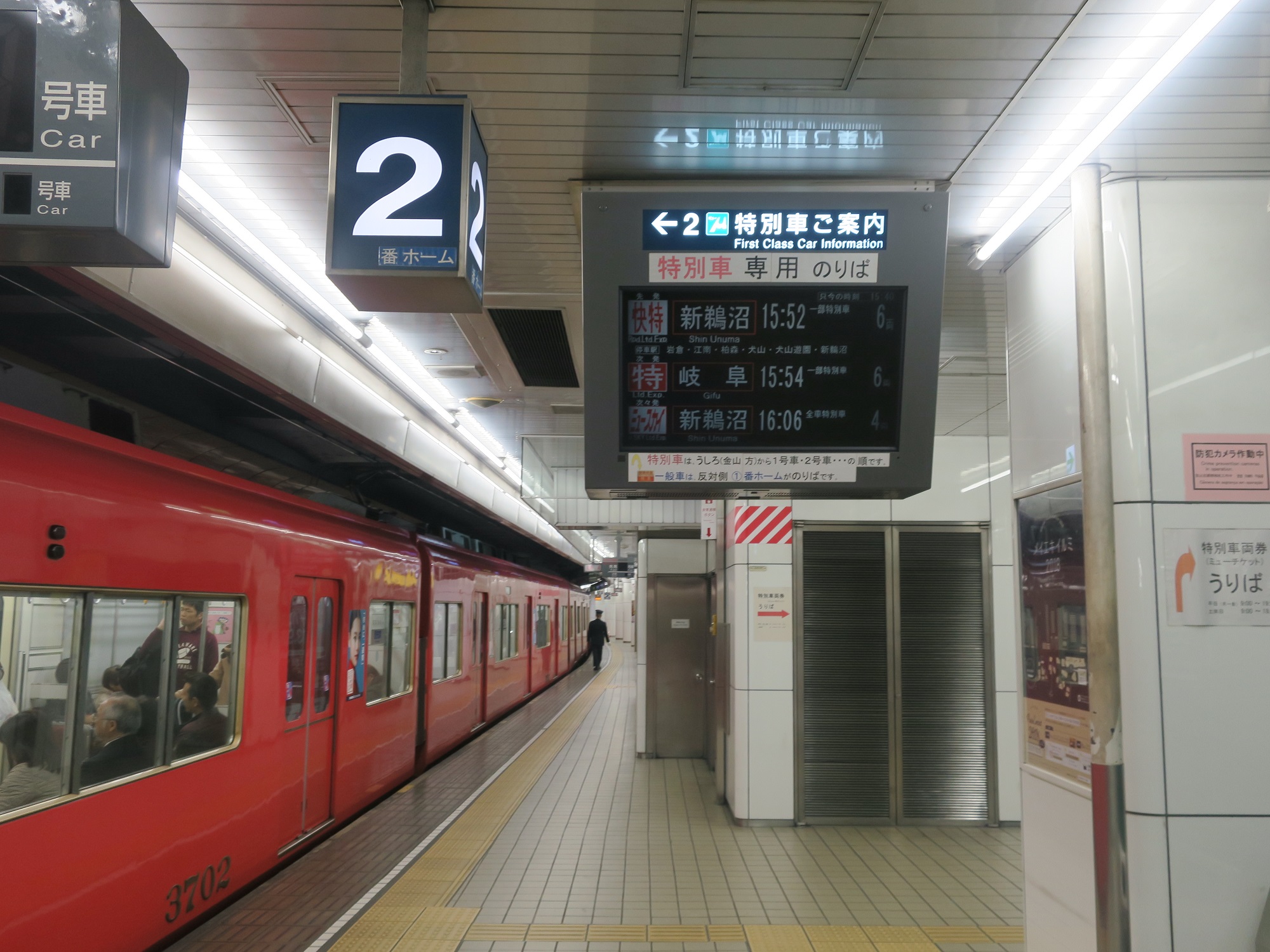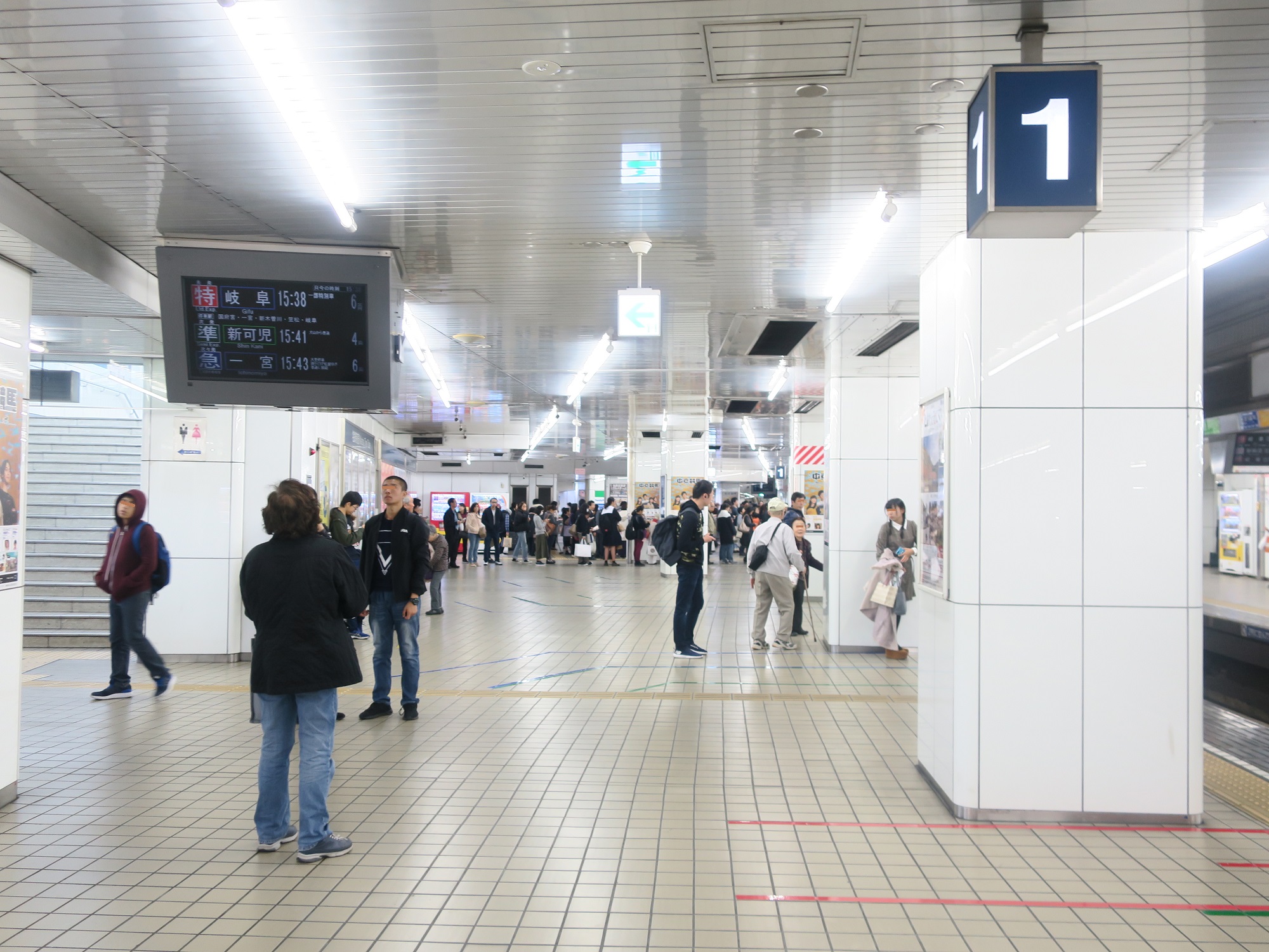 上の写真が1番線(一般車乗車用)、下の写真が2番線(降車・特別車乗車用)です。主に、一宮・岐阜・津島・岩倉・犬山・新鵜沼方面に行く列車が発着します。