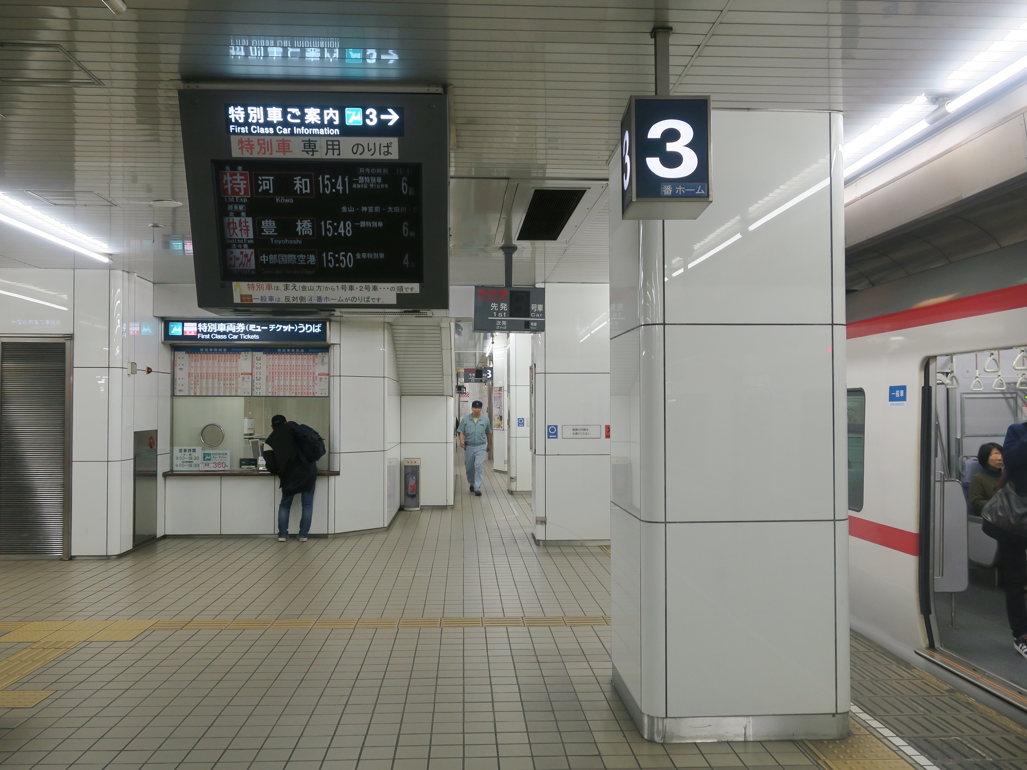 写真は2番線・3番線で、降車用ホームです。また、ミュースカイ、快速特急、特急の特別車(指定席)は、2番線・3番線から乗車します。一般車は、反対側のホーム、1番線・4番線から乗車します。