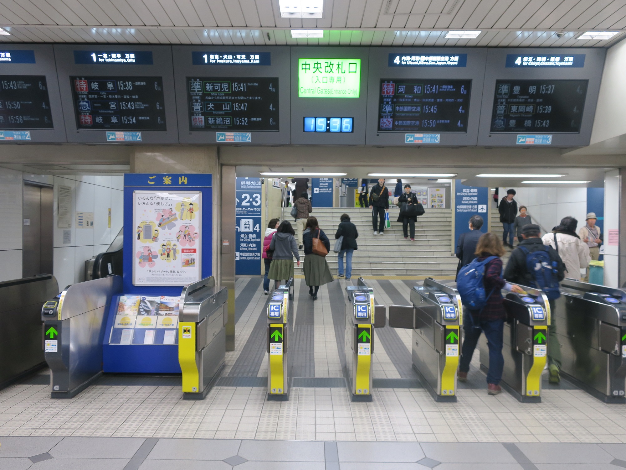 中央改札口です。1番線と4番線しかないというのに、行先別に列車がずらりと並んでいます。名鉄は全線でICカードが使えます。このため、manacaやSuicaなどのICカード対応の自動改札機が並びます。