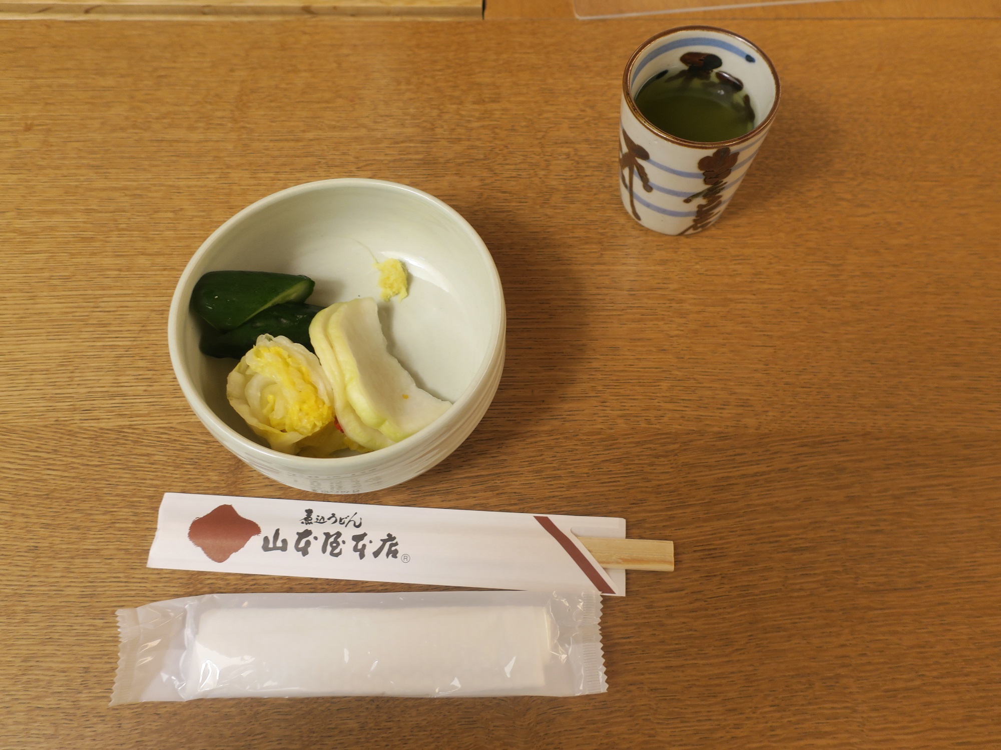 味噌煮込みうどんを注文すると、お漬物が出てきます。お漬物は、食べ放題です。