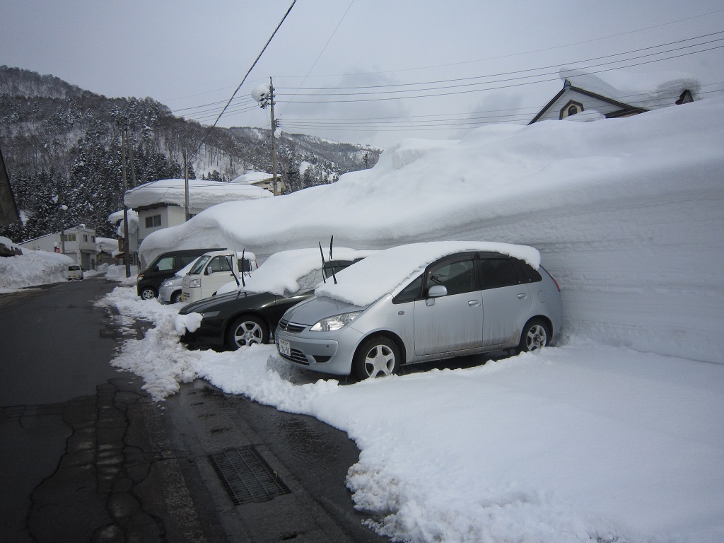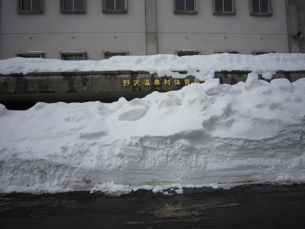 実はこれ、野沢温泉村体育館の正面玄関なんです。なので、この雪の壁の向こうには、体育館の入り口があるんです。ところが、雪の壁が入り口をふさいでしまっていて、ご覧の通りの状態なんです。