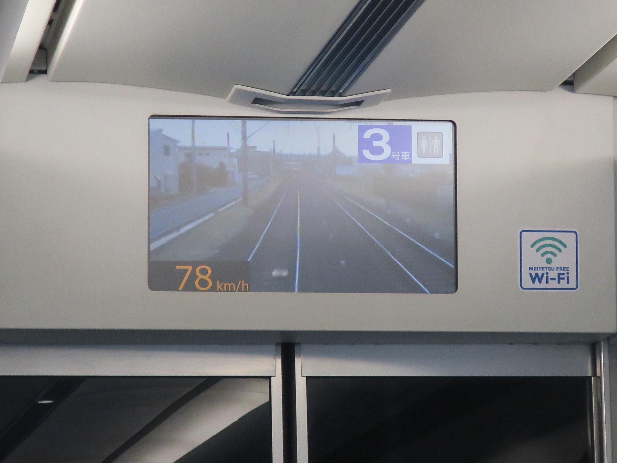 名鉄と言えばパノラマカーというイメージが未だにキューティー吉本の頭の中に残る中で、ミュースカイには展望席が付いていません。なぜ展望席を付けなかったのかというと、名鉄って列車の増結を結構やる会社でして、展望車に他の列車を増結すると通り抜けができないうえ、展望車の意味がなくなってしまうからなのではないかと思います。その代わりと言っては何ですが、車内の液晶パネルに運転台からの前面展望が表示されます。でもやっぱり、展望車付けて欲しかったなぁ。