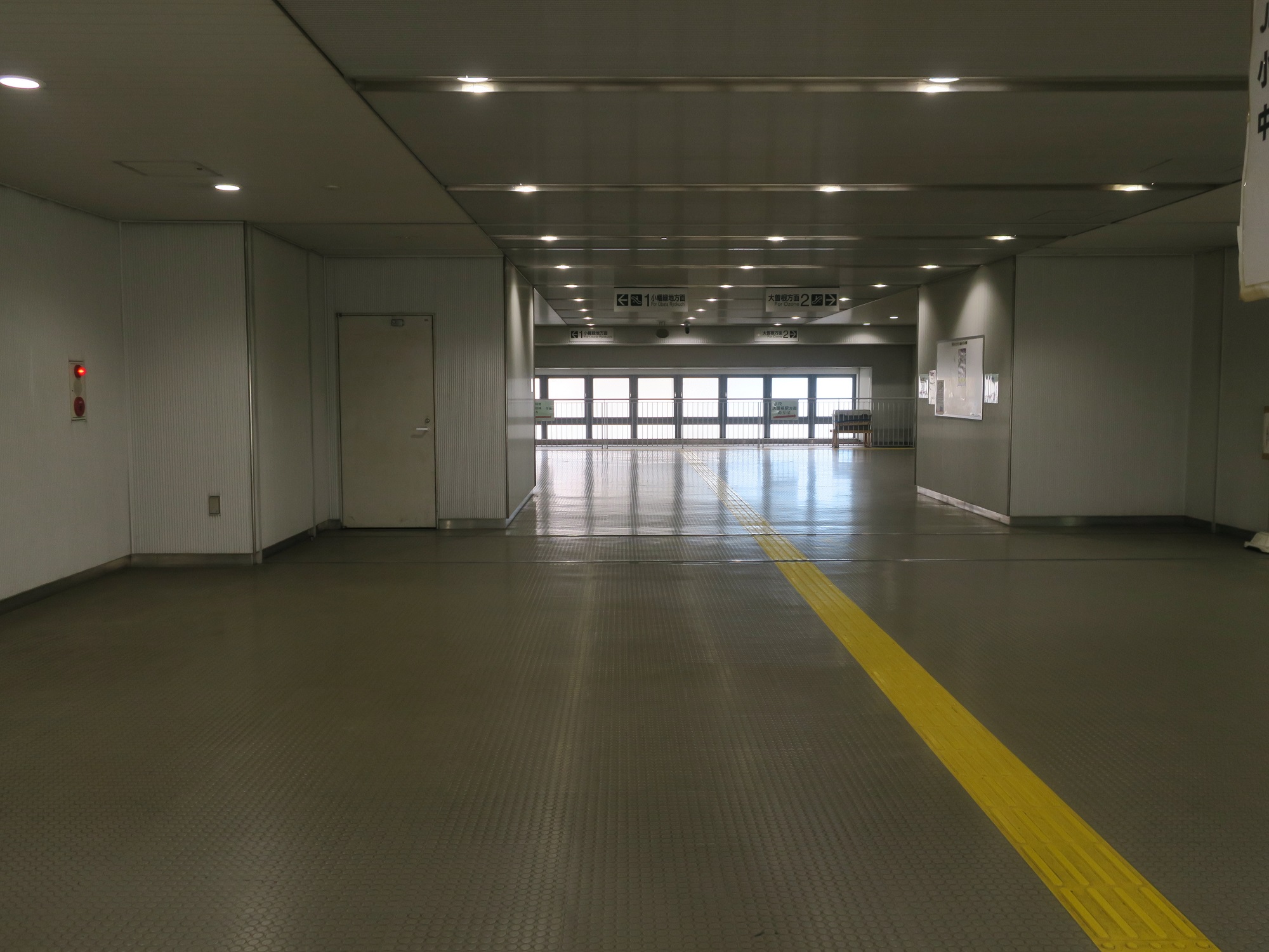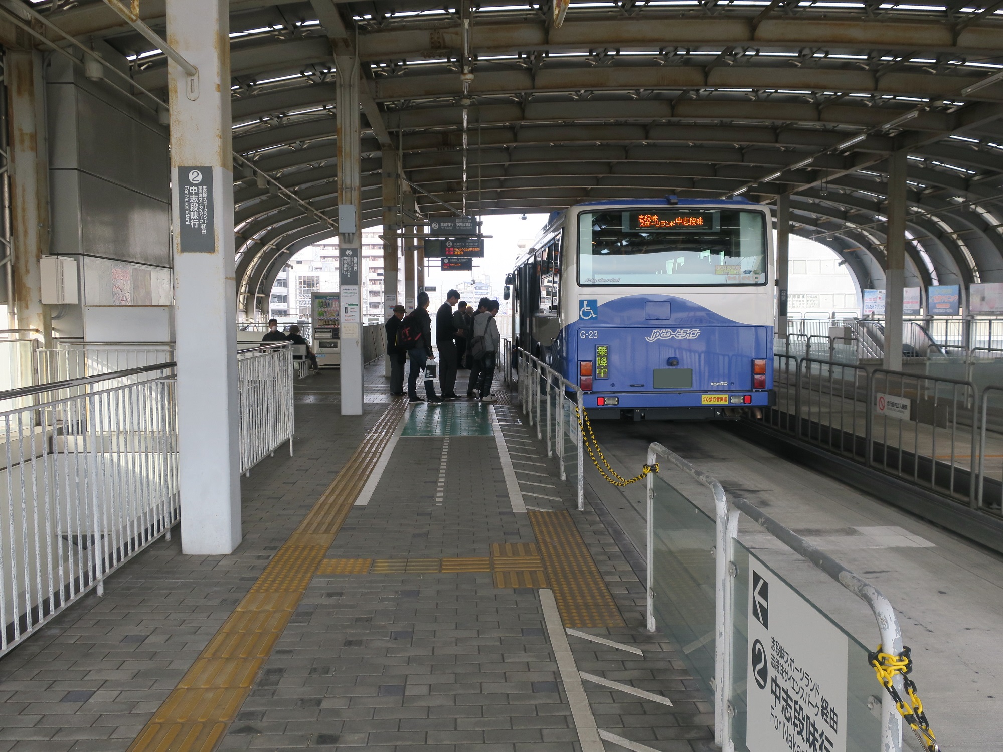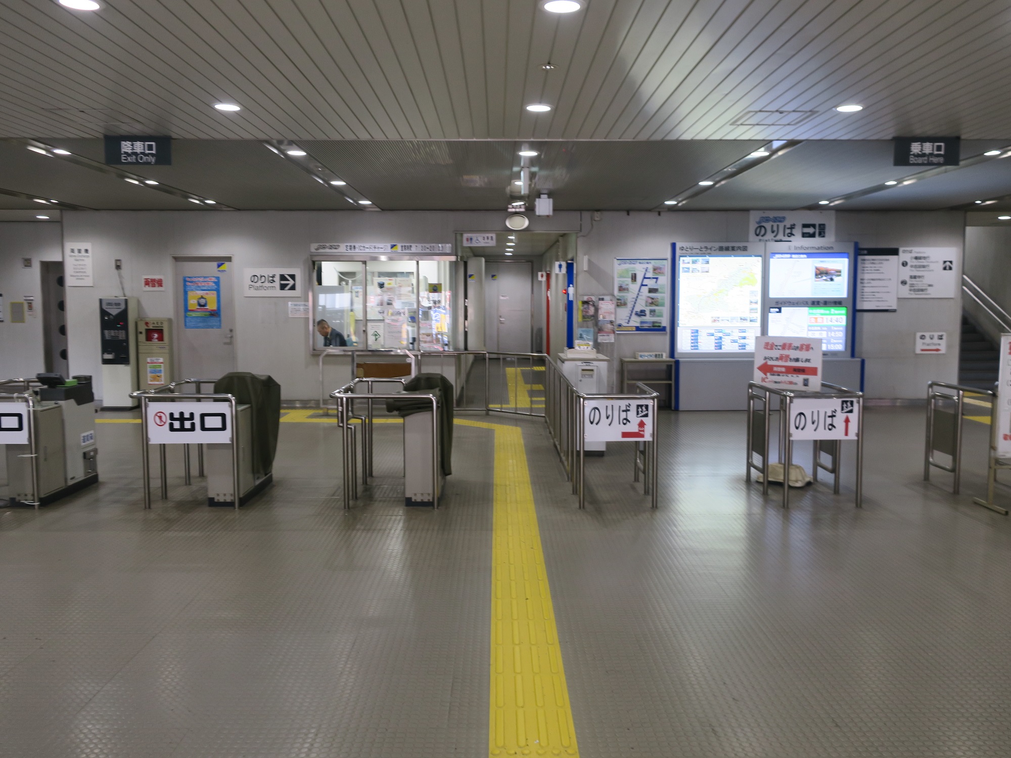 ここが改札口です・・・ていうか、自動改札機はおろか、運賃箱もありません。ただの通路です。なぜかと言うと、運賃はバスを降りるときに支払うので、改札を作る必要がないのです。SuicaなどのICカードを使うときは、バスを乗り降りするときにタッチする仕組みです。