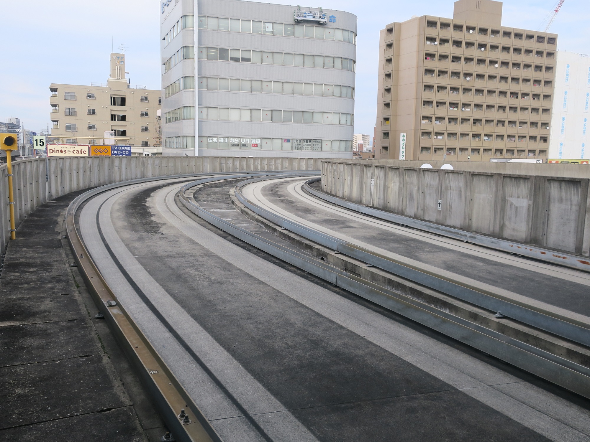 ちなみに、このバスは普通の道路も走れます。事実、ゆとりーとラインも末端区間は普通の道路を走ります。高架橋の上は信号も渋滞もないので、ここを走っているときは超快適です。高架橋を作るお金がなければ、普通の道路を走らせることもできるという、確かにコストは電車より安いかも知れませんが、末端区間で渋滞にはまり、ダイヤ通りに来ないケースがあります。