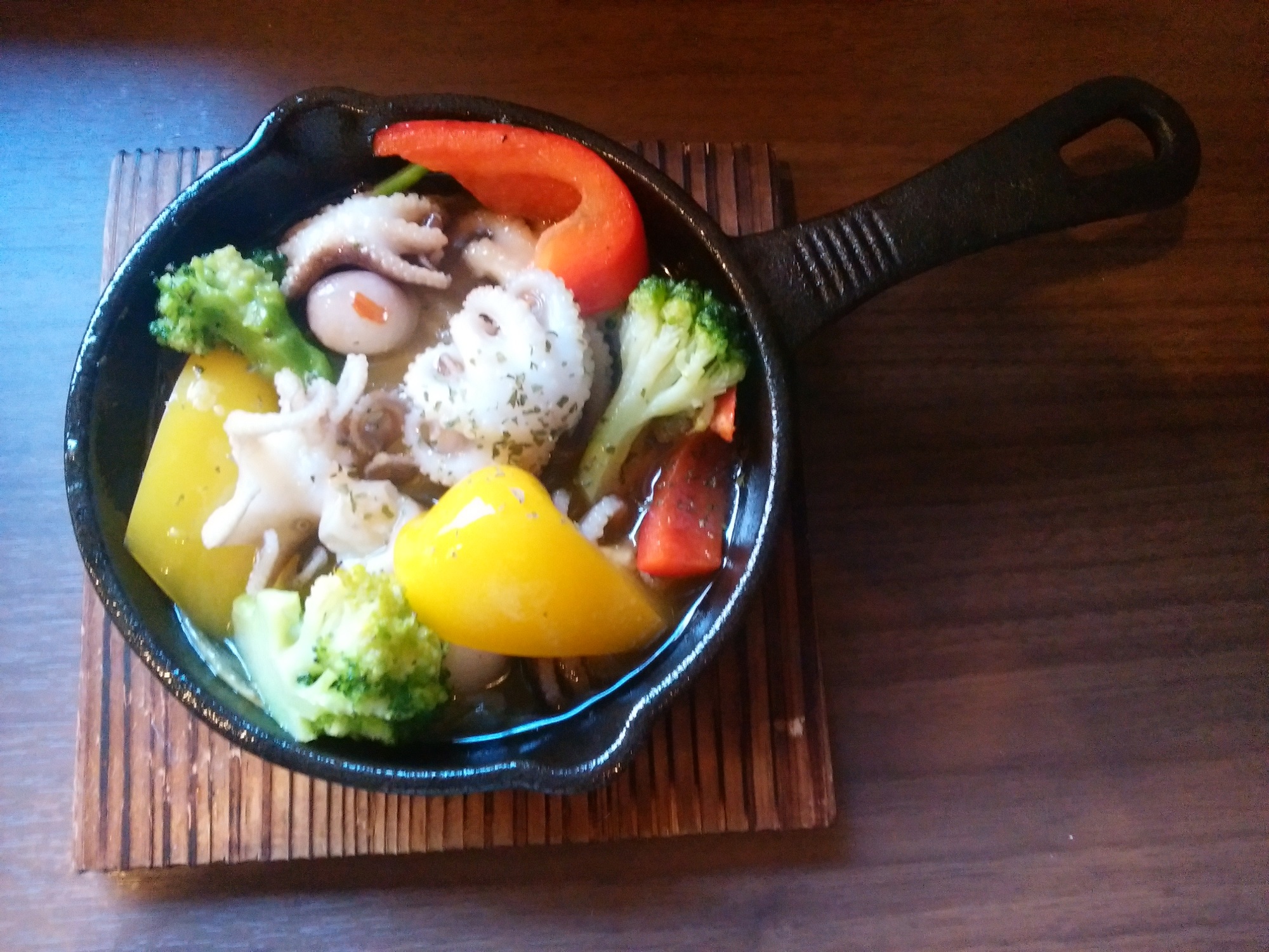 次に頼んだのが、イイダコのアヒージョ。お値段は880円と結構なお値段だったんですけど、はっきり言ってこれはハズレ。なぜかと言うと、アヒージョってオリーブオイルにニンニクと色々な具材を入れてオーブン焼きにしたもののはずなのに、これニンニクが入っていないんですね。ここは舞浜ユーラシアみたく、ニンニクを丸っと入れないとダメでしょう。