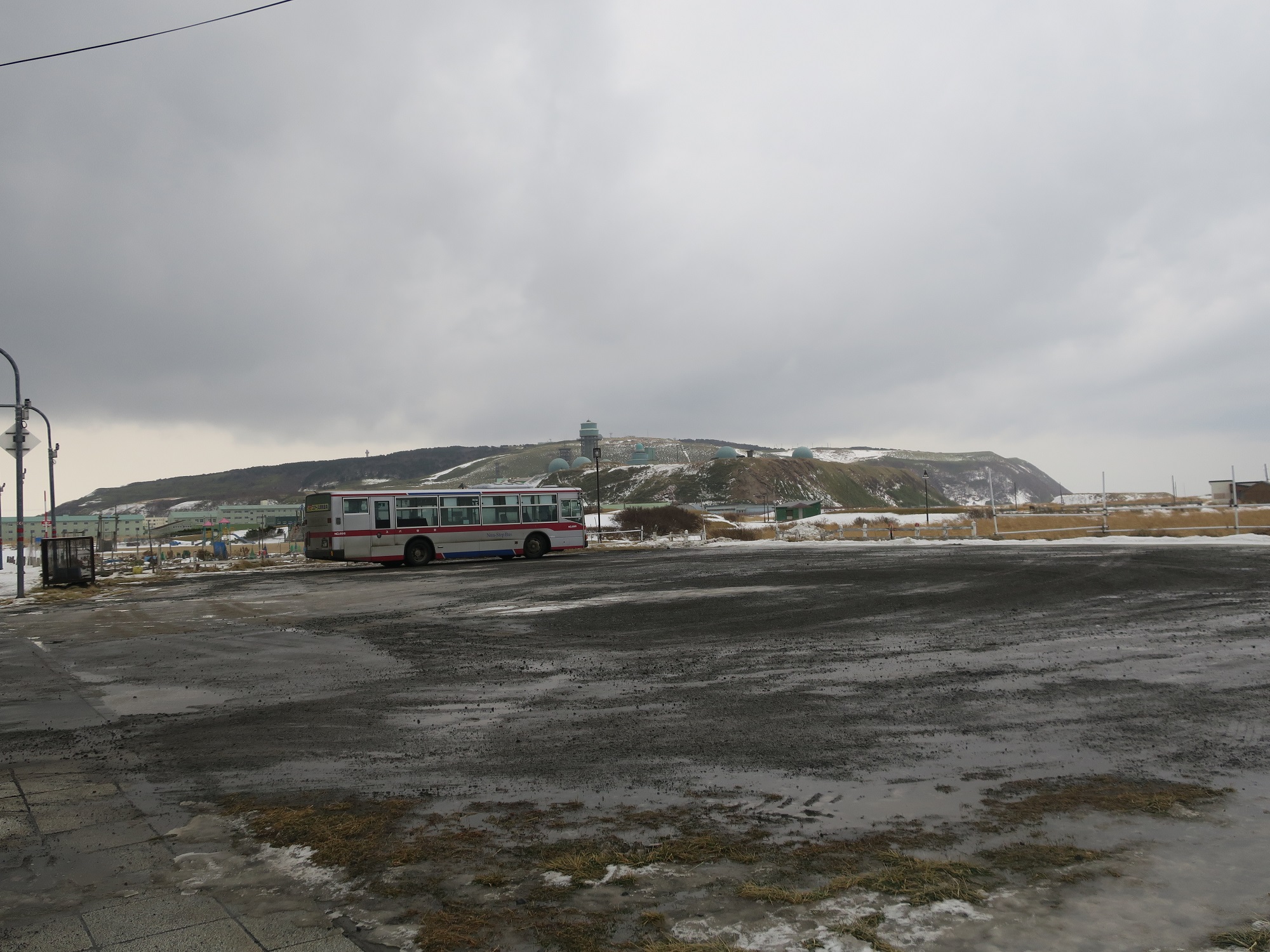 稚内市内バスは日中おおむね15分に1本出ているのですが、大半はここノシャップで折り返します。このため、バスが回転できるようにこれだけの広さなのです。片隅には、稚内駅前バスターミナル方面に行くバスが待機していました。それにしても、広い。