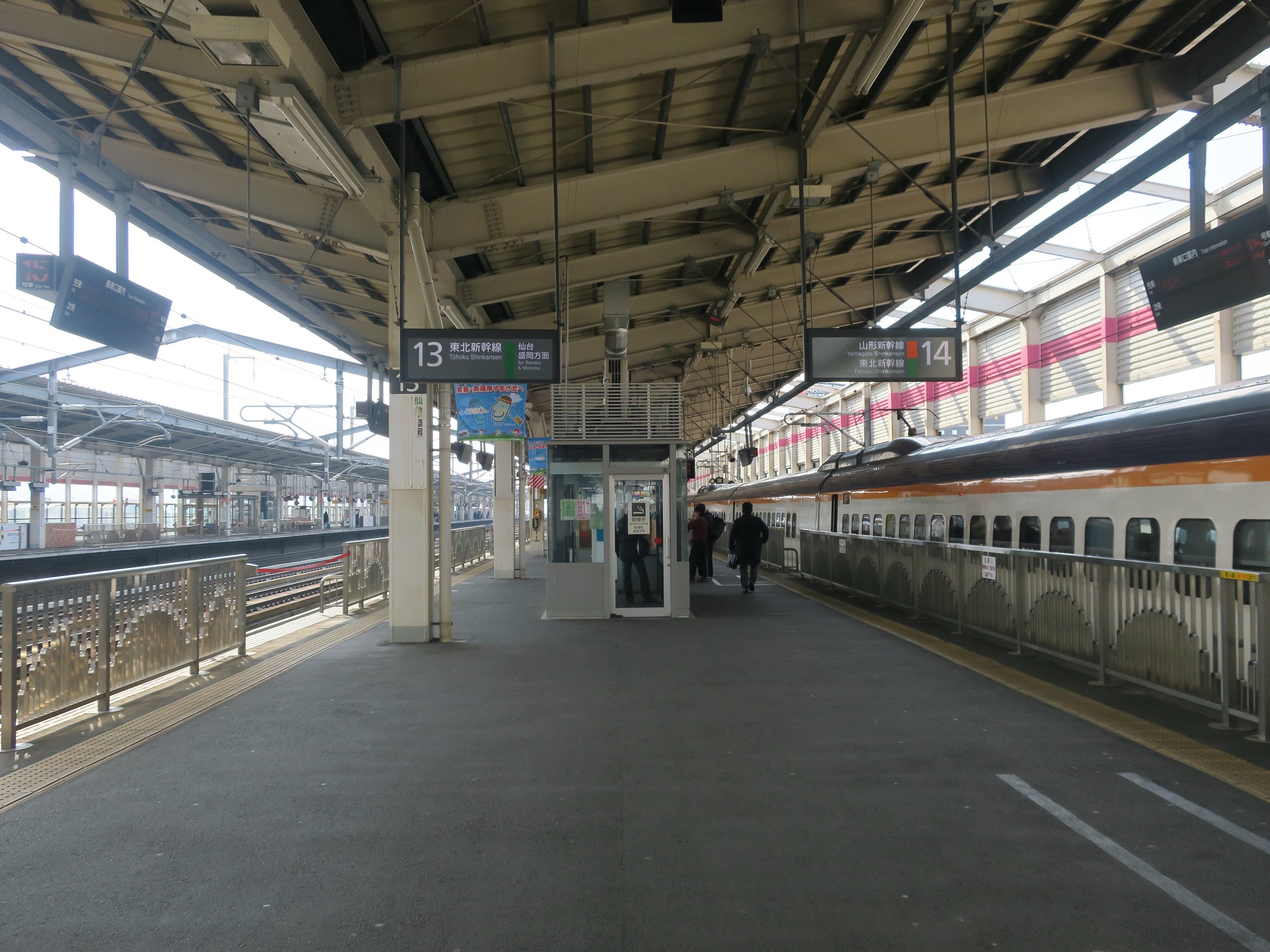 13番線・14番線です。13番線は主に東北新幹線で、仙台・盛岡・新青森と、北海道新幹線で新函館北斗方面に行く列車が発着します。14番線は主に山形新幹線(奥羽本線)で米沢・山形・新庄方面に行く列車が発着します。