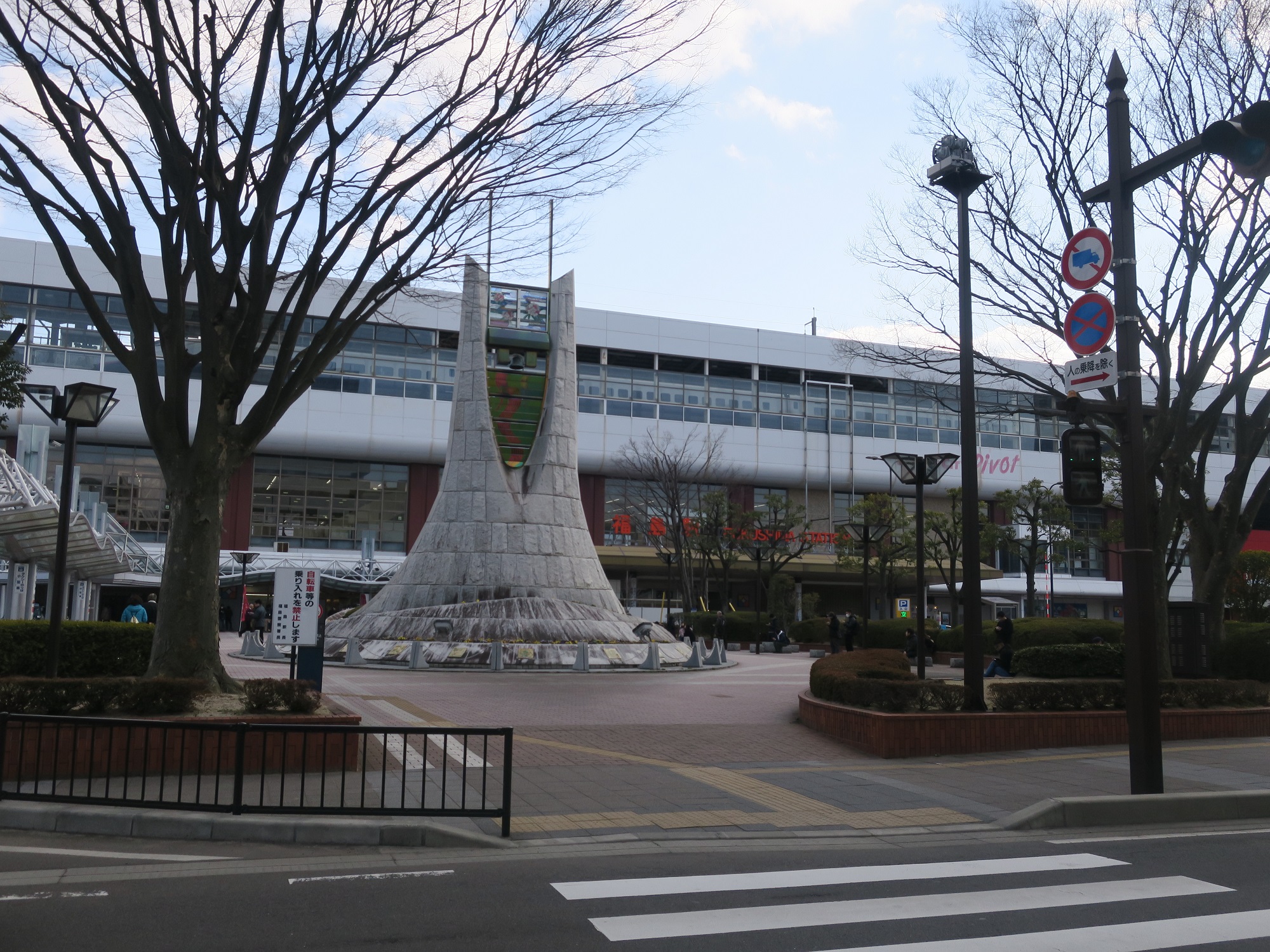 福島駅の西口です。駅前広場には、モニュメントが建っています。