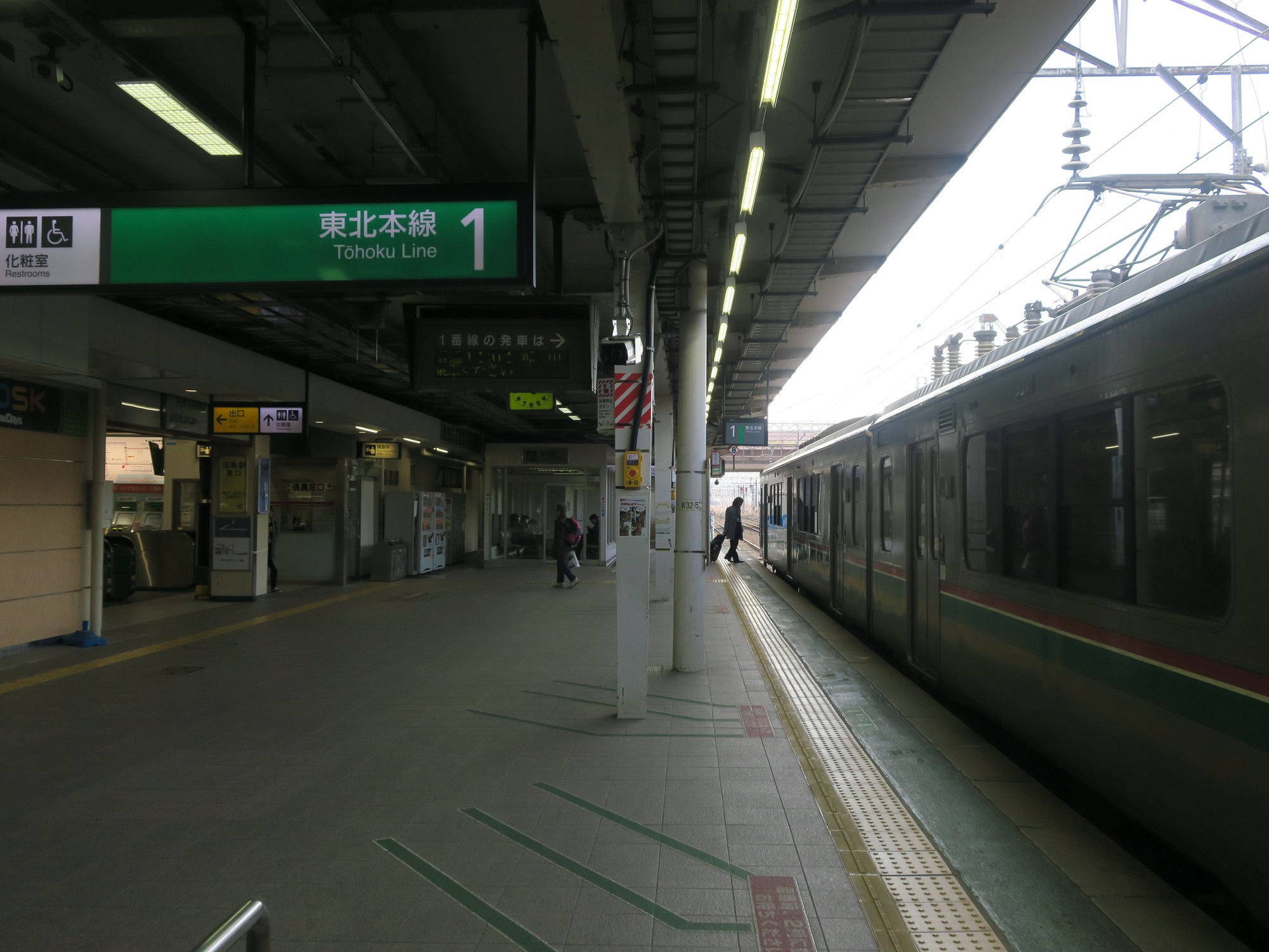 在来線は、原則として福島駅を跨いで発着する列車はなく、すべての列車が福島駅で折り返します。1番線です。東北本線で、郡山・新白河方面に行く列車が発着します。便数は日中時間帯でおよそ1時間に1本ぐらいです。