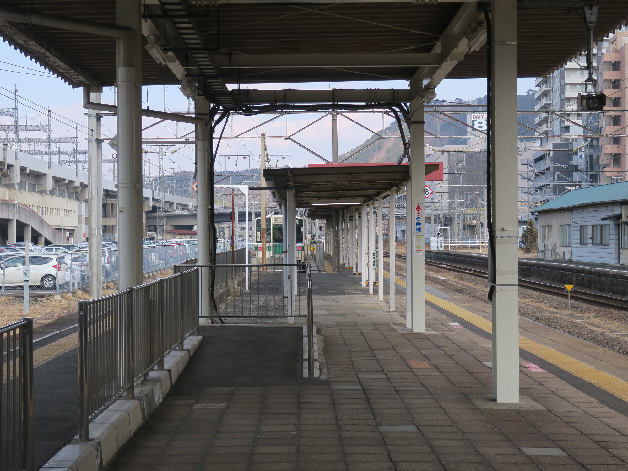 4番線・5番線の北側に、6番線があります。6番線は奥羽本線(山形線)で、米沢方面に行く列車が発着します。山形線の福島-米沢は完全に秘境駅状態でして、2~3時間に1本ぐらいしか走っていないのですが、山形新幹線を通すために線路幅が在来線と異なるため、どうしても2本の列車を折り返したかったのか、こういうホームの形状になったみたいです。