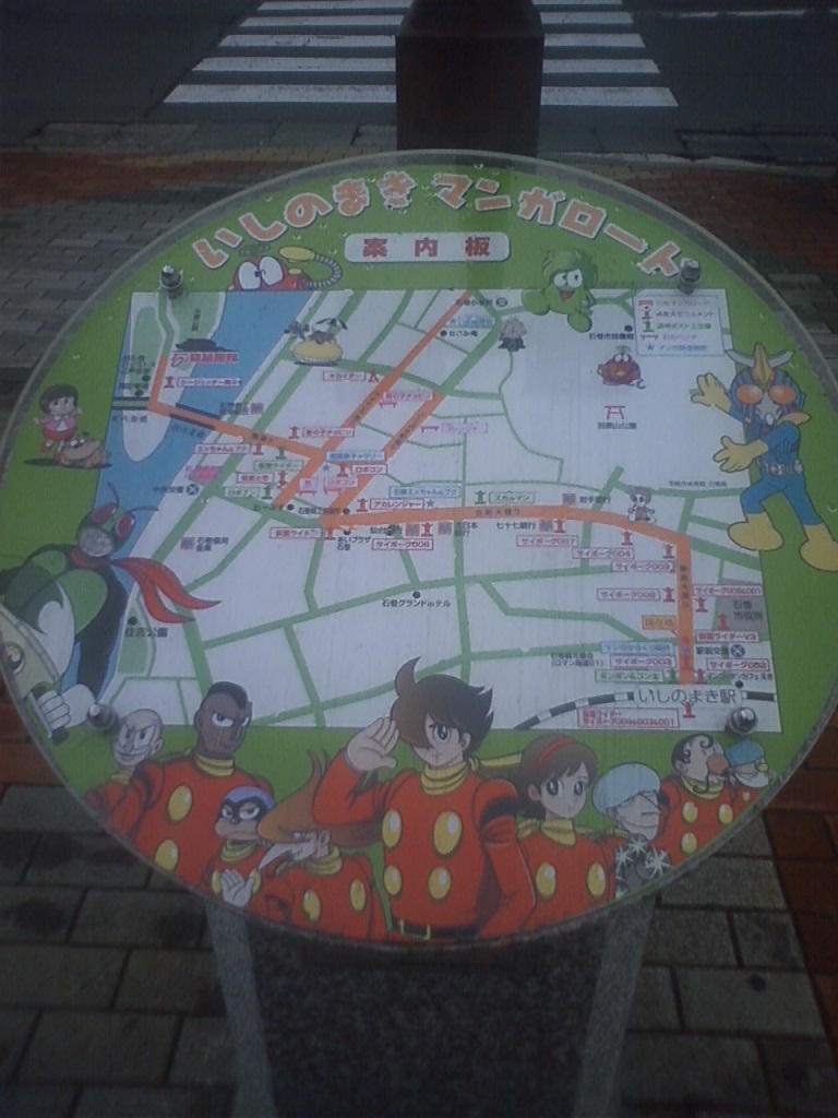 2日目。仙台駅から仙石東北ラインに乗って、石巻駅へ。ここから女川駅まで行きたいのですが、しばらく時間があったので、石巻駅周辺のマンガロードをぶらぶらします。石巻は石ノ森章太郎のゆかりの地でして、マンガで町おこしをしています。