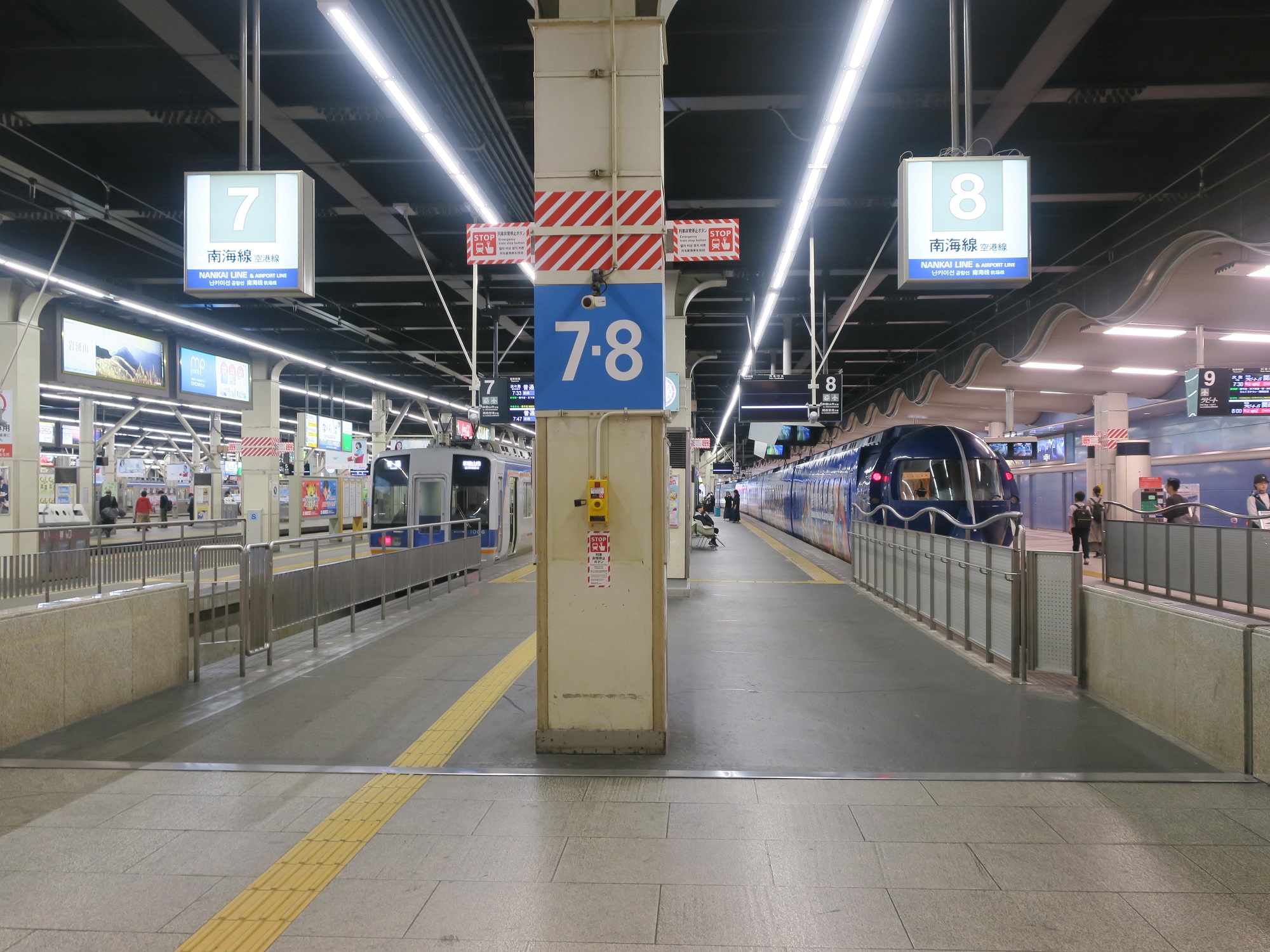 南海本線と南海高野線の駅で、泉北高速線と空港線の列車が乗り入れます。私鉄の駅としては最大級の大きさで、全部で8本の列車が停まれます。しかも、すべてのホームに降車ホームがあります。(正確に言うと、9番線の降車ホームが8番線)