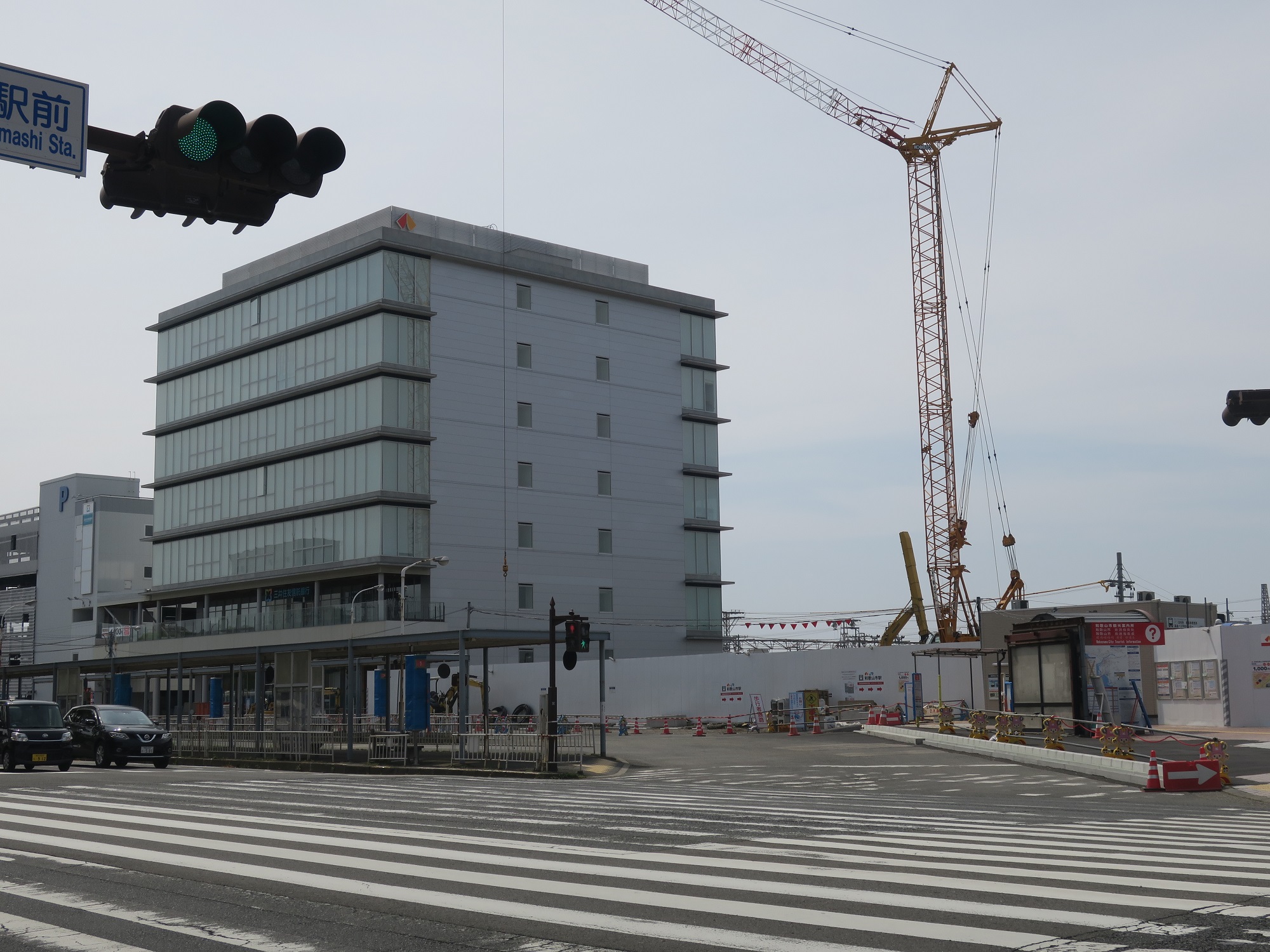 新しい駅ビルのうち、オフィス棟はすでに完成していました。手前にバスターミナルがあります。