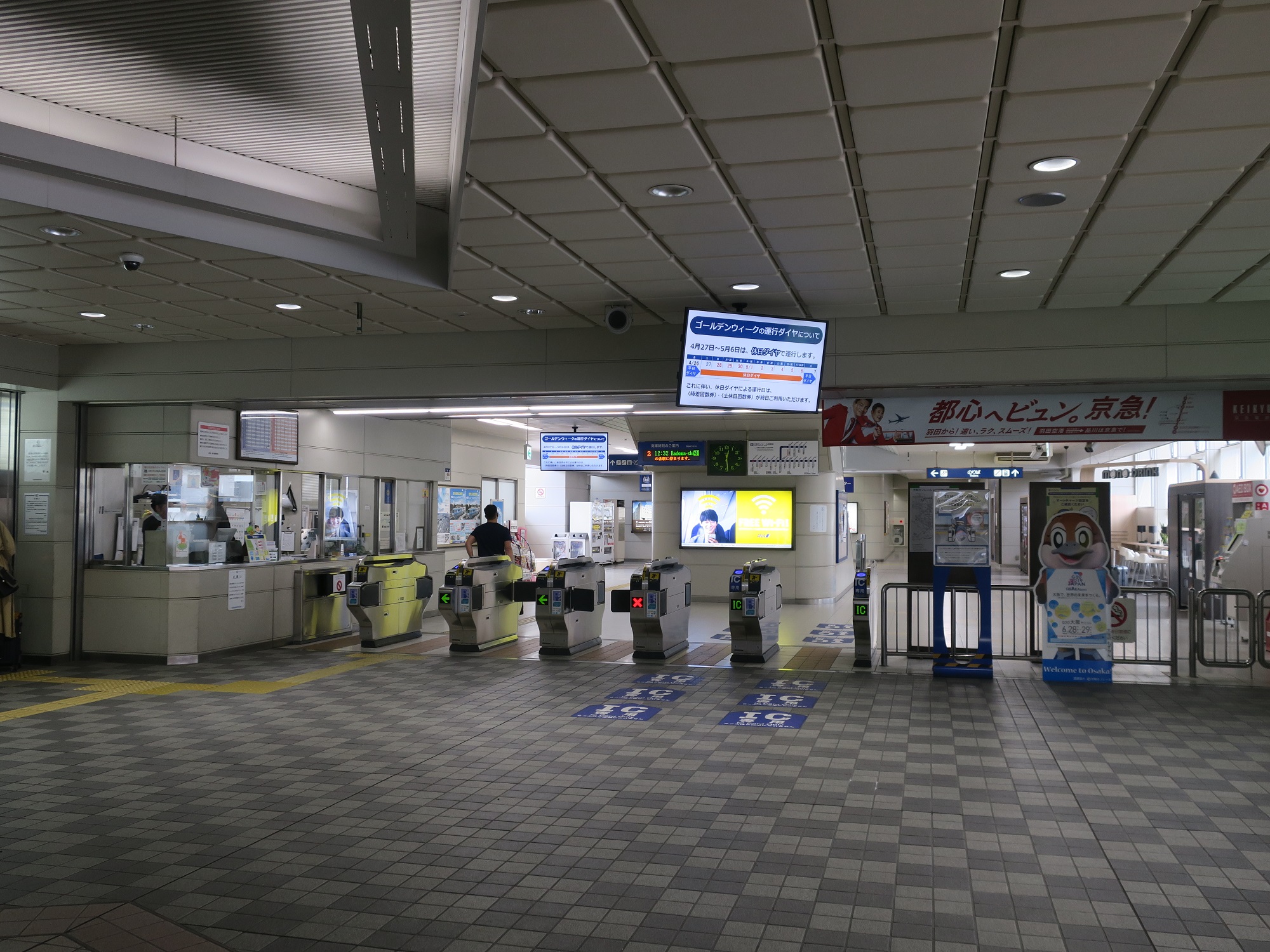 改札口です。PiTaPa・ICACA・Suica・PASMOなどの交通系ICカード対応の自動改札機が並びます。