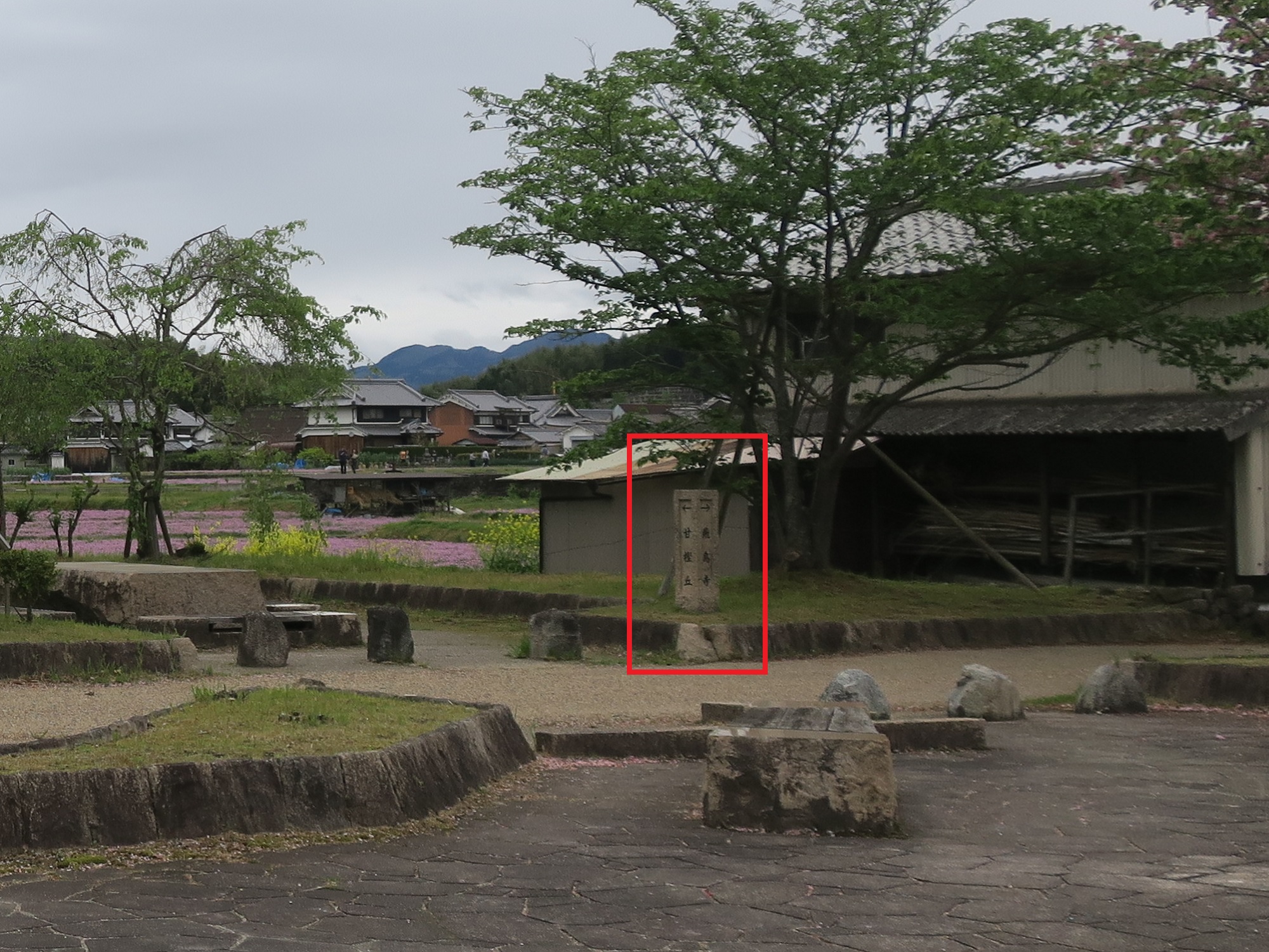 この写真を拡大しました。右側に、飛鳥寺への案内表示があります。