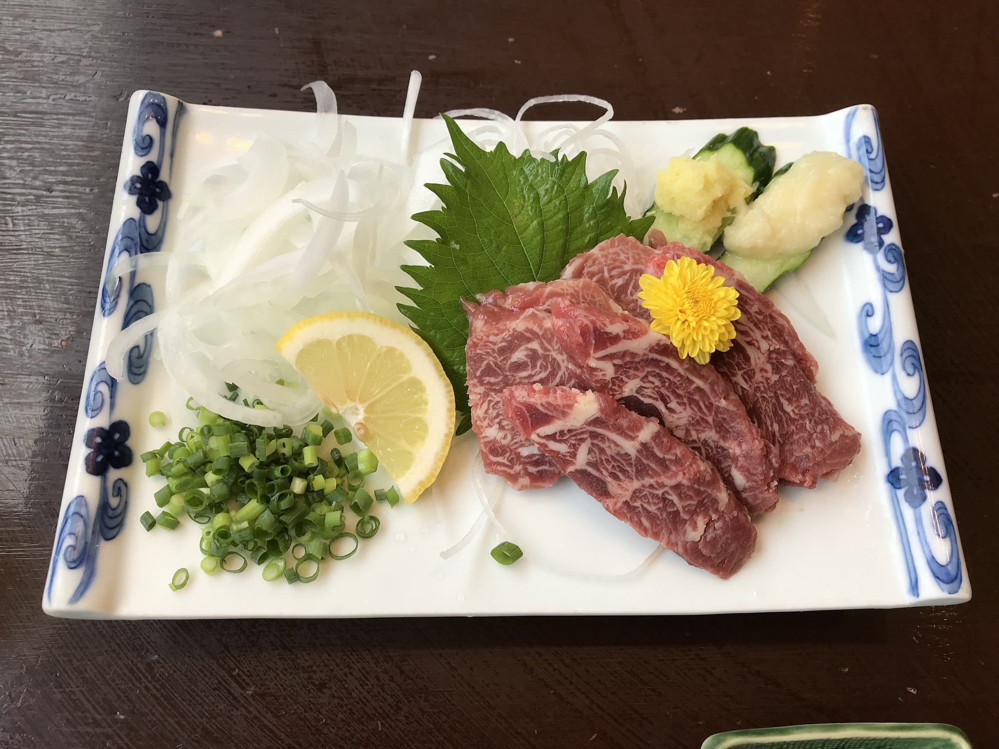 で、今日の呑みです。まずは、馬刺しを注文。これ、しっかり脂がのっていまして、濃厚なお味です。